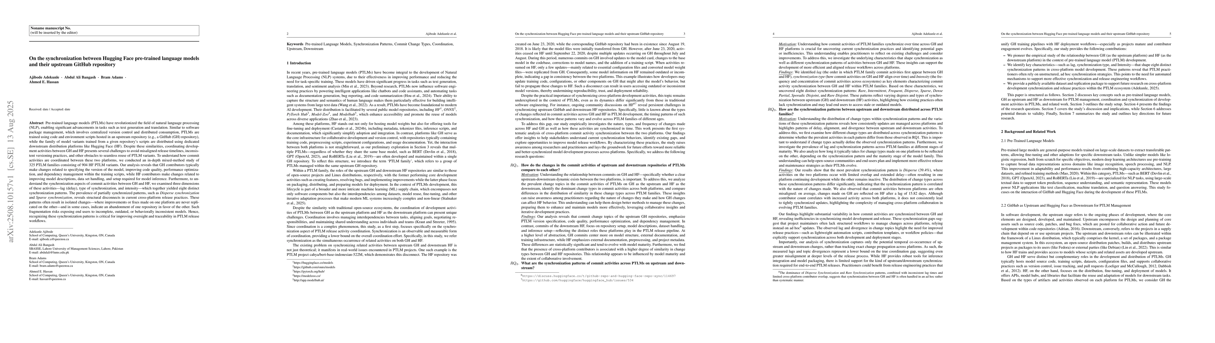 A mixed-method study involving 325 PTLM families (904 HF variants) was conducted to analyze commit activities between GitHub (GH) and Hugging Face (HF). The study examined three dimensions of these activities: lag (delay), type of synchronization, and intensity, identifying eight distinct synchronization patterns.