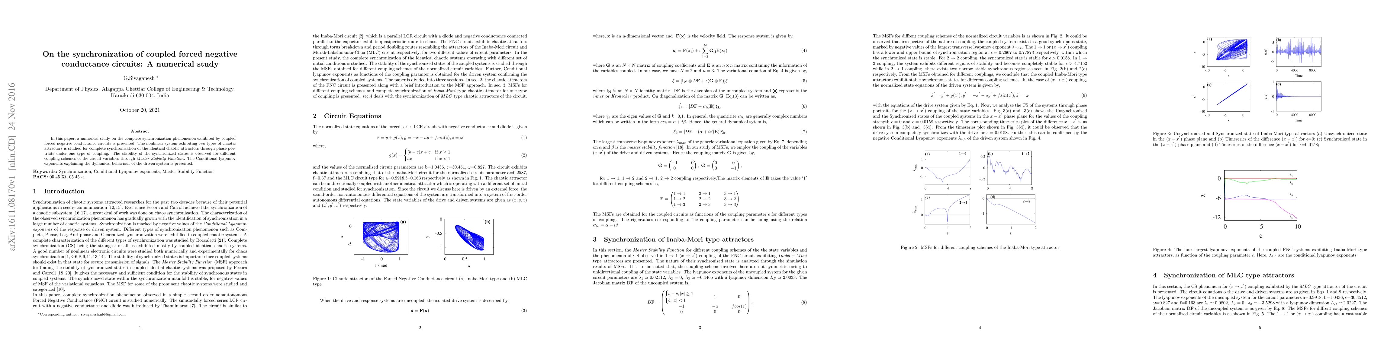 This paper investigates the synchronization of coupled forced negative conductance circuits, focusing on the complete synchronization of chaotic attractors through numerical analysis. The study employs the Master Stability Function to assess stability and uses conditional Lyapunov exponents to elucidate the dynamics of the system.