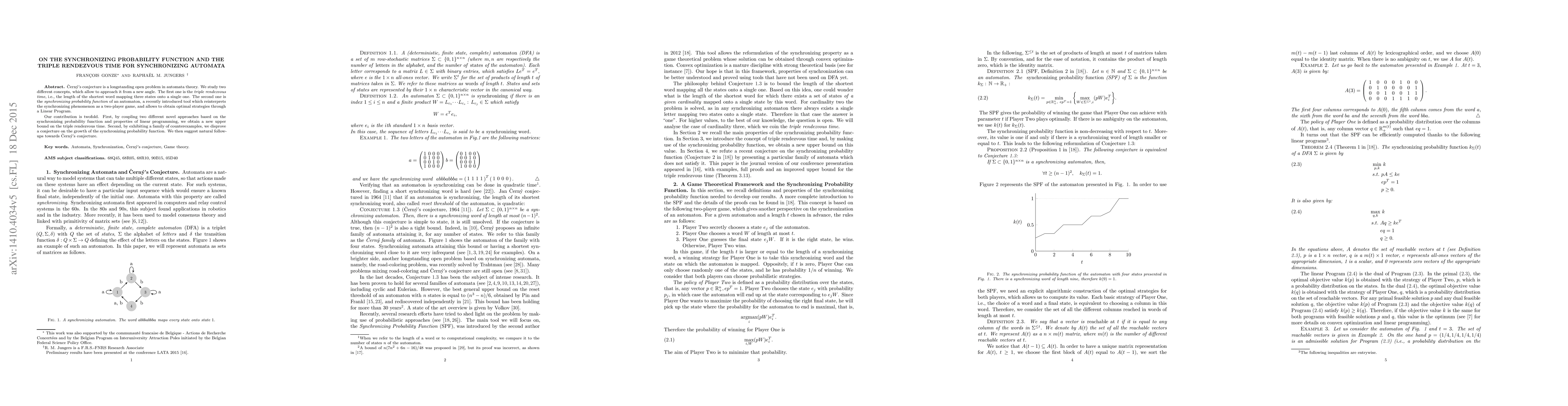This research paper introduces novel approaches using the synchronizing probability function and linear programming to study Cerny's conjecture in automata theory. It presents a new upper bound for the triple rendezvous time and disproves a conjecture on the growth of the synchronizing probability function, suggesting further directions for addressing Cerny's conjecture.