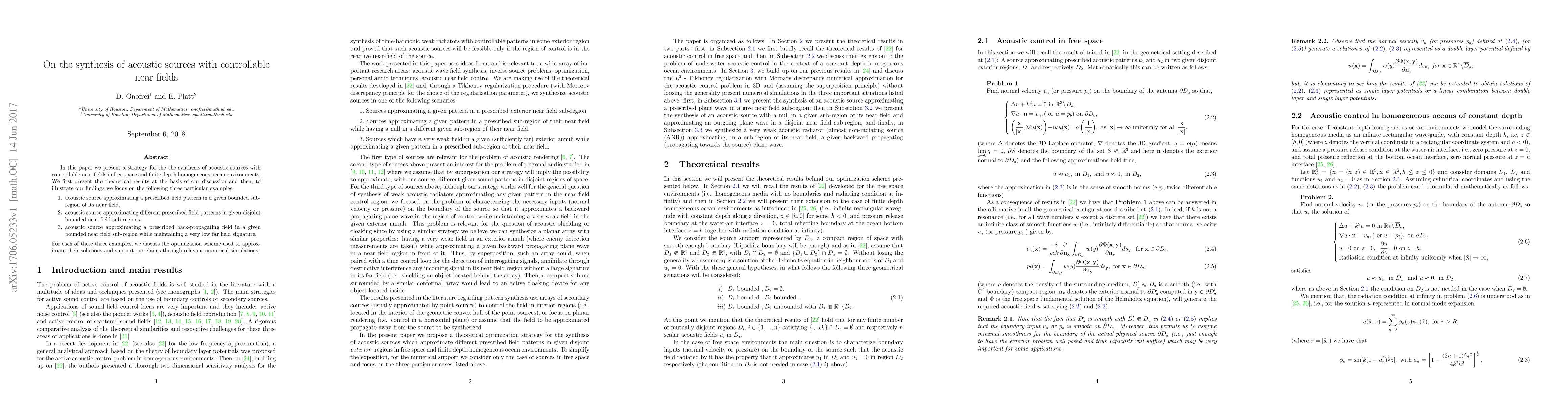 In this paper we present a strategy for the the synthesis of acoustic sources with controllable near fields in free space and finite depth homogeneous ocean environments. We first present the theoretical results at the basis of our discussion and then, to illustrate our findings we focus on the following three particular examples: 1. acoustic source approximating a prescribed field pattern in a given bounded sub- region of its near field. 2. acoustic source approximating different prescribed field patterns in given disjoint bounded near field sub-regions. 3. acoustic source approximating a prescribed back-propagating field in a given bounded near field sub-region while maintaining a very low far field signature. For each of these three examples, we discuss the optimization scheme used to approx- imate their solutions and support our claims through relevant numerical simulations.