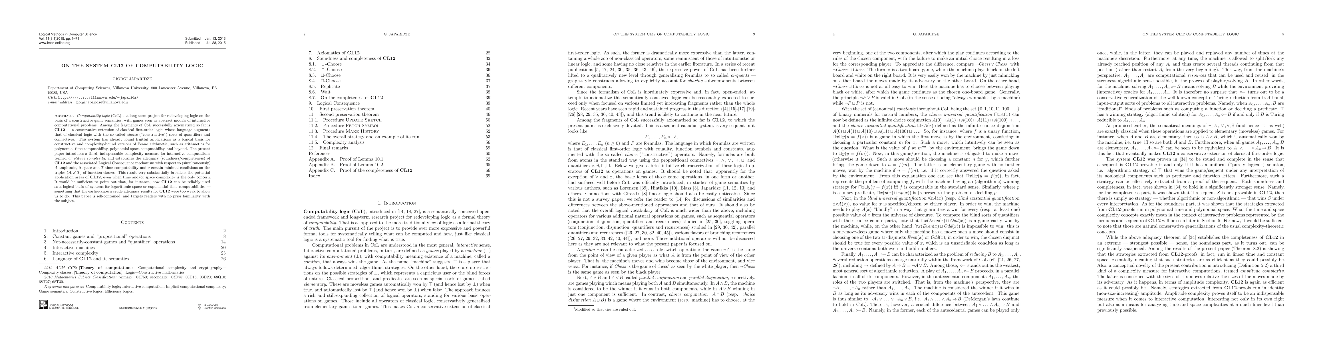 Computability logic (see http://www.csc.villanova.edu/~japaridz/CL/) is a long-term project for redeveloping logic on the basis of a constructive game semantics, with games seen as abstract models of interactive computational problems. Among the fragments of this logic successfully axiomatized so far is CL12 --- a conservative extension of classical first-order logic, whose language augments that of classical logic with the so called choice sorts of quantifiers and connectives. This system has already found fruitful applications as a logical basis for constructive and complexity-oriented versions of Peano arithmetic, such as arithmetics for polynomial time computability, polynomial space computability, and beyond. The present paper introduces a third, indispensable complexity measure for interactive computations termed amplitude complexity, and establishes the adequacy of CL12 with respect to A-amplitude, S-space and T-time computability under certain minimal conditions on the triples (A,S,T) of function classes. This result very substantially broadens the potential application areas of CL12. The paper is self-contained, and targets readers with no prior familiarity with the subject.