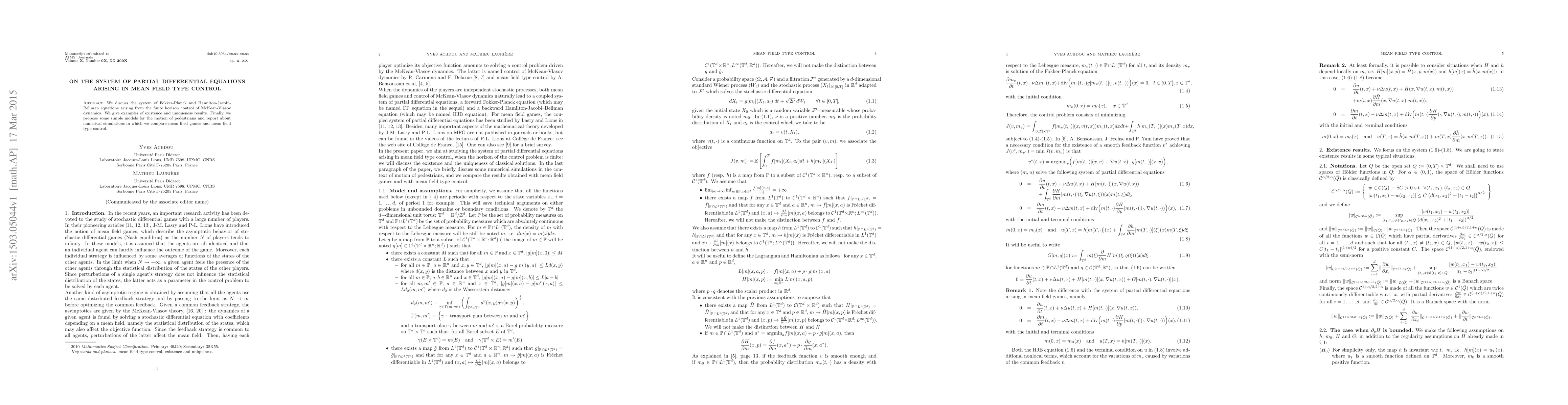 We discuss the system of Fokker-Planck and Hamilton-Jacobi-Bellman equations arising from the finite horizon control of McKean-Vlasov dynamics. We give examples of existence and uniqueness results. Finally, we propose some simple models for the motion of pedestrians and report about numerical simulations in which we compare mean filed games and mean field type control.