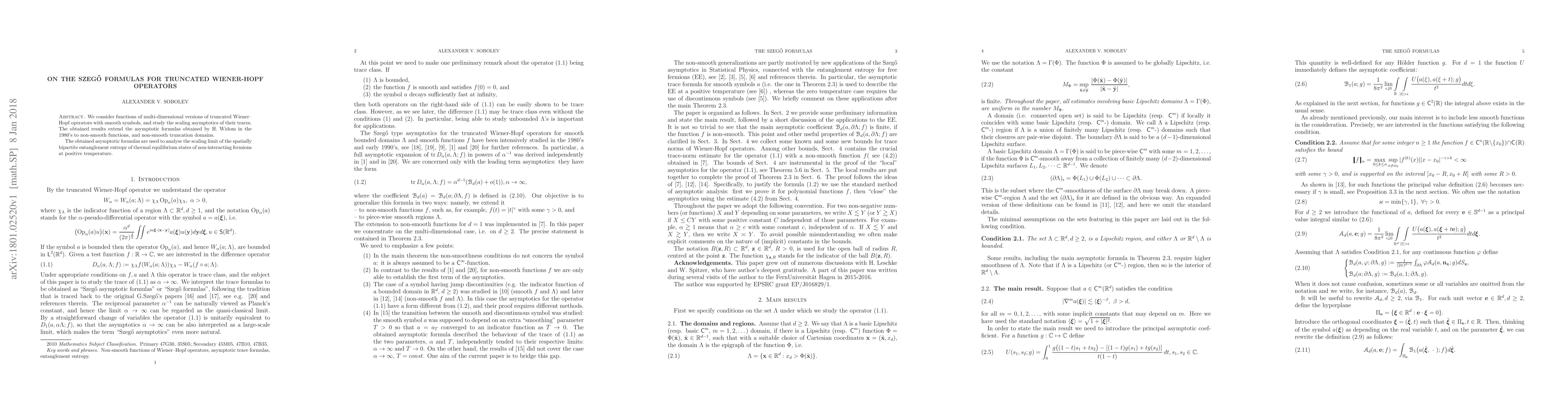This paper extends the Szegő formulas for truncated Wiener-Hopf operators to non-smooth functions and domains, providing new asymptotic formulas for their trace scaling. These results are applied to analyze the spatially bipartite entanglement entropy in thermal equilibrium states of non-interacting fermions.