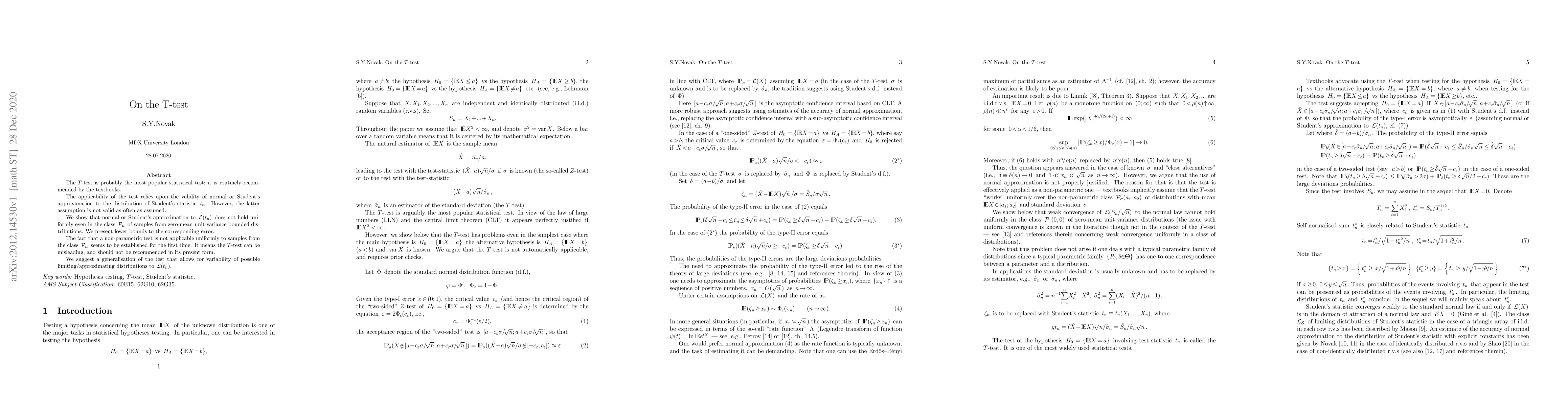 This paper critiques the $T$-test's reliance on normal or Student's approximation, showing it often fails even in bounded distributions. It proposes a generalized version of the $T$-test that accounts for variability in limiting distributions, suggesting the current form can be misleading.