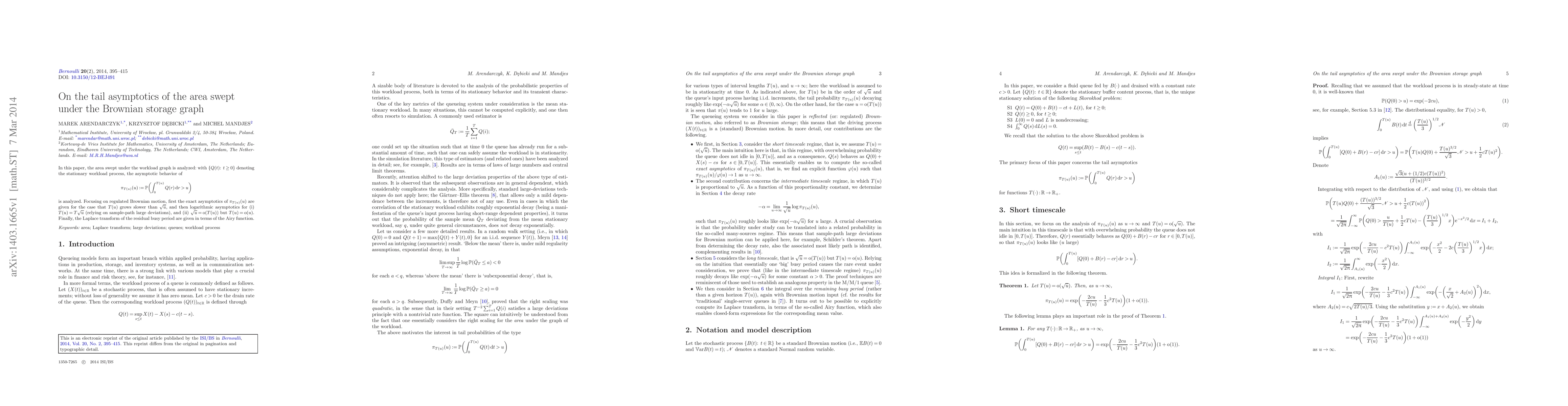 In this paper, the area swept under the workload graph is analyzed: with $\{Q(t) : t\ge0\}$ denoting the stationary workload process, the asymptotic behavior of \[\pi_{T(u)}(u):={\mathbb{P}}\biggl(\int_0^ {T(u)}Q(r)\,\mathrm{d}r>u\biggr)\] is analyzed. Focusing on regulated Brownian motion, first the exact asymptotics of $\pi_{T(u)}(u)$ are given for the case that $T(u)$ grows slower than $\sqrt{u}$, and then logarithmic asymptotics for (i) $T(u)=T\sqrt{u}$ (relying on sample-path large deviations), and (ii) $\sqrt{u}=\mathrm{o}(T(u))$ but $T(u)=\mathrm{o}(u)$. Finally, the Laplace transform of the residual busy period are given in terms of the Airy function.