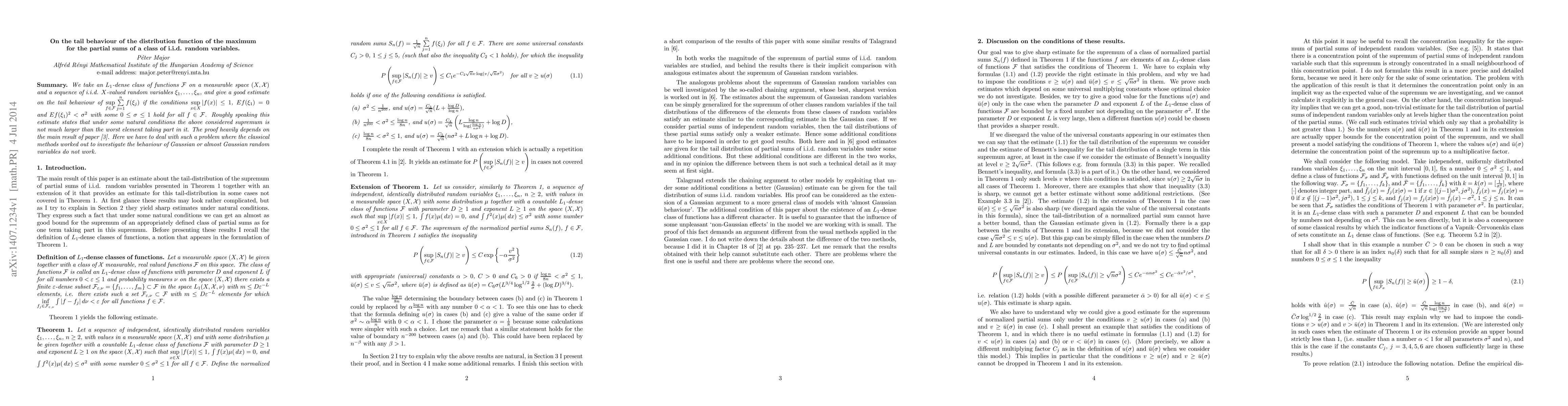 This paper provides an estimate for the tail behavior of the distribution function of the maximum of partial sums of a sequence of i.i.d. random variables, under conditions that restrict the functions and their moments. The estimate shows that the supremum of these sums is not significantly larger than the worst individual function in the class, relying on results from a referenced paper for its proof.