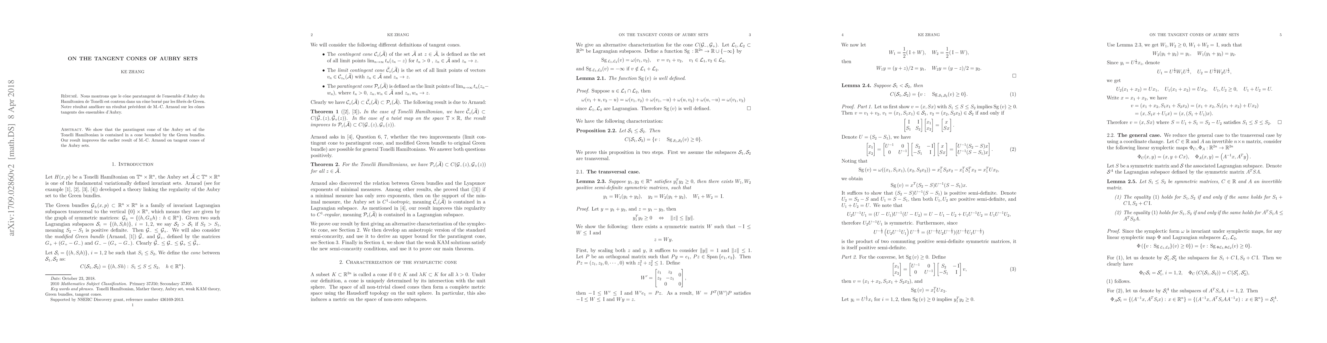 Summary: This paper demonstrates that the paratingent cone of the Aubry set for a Tonelli Hamiltonian is contained within a cone bounded by the Green bundles, thereby enhancing the previous findings of M.-C. Arnaud on Aubry set tangent cones.