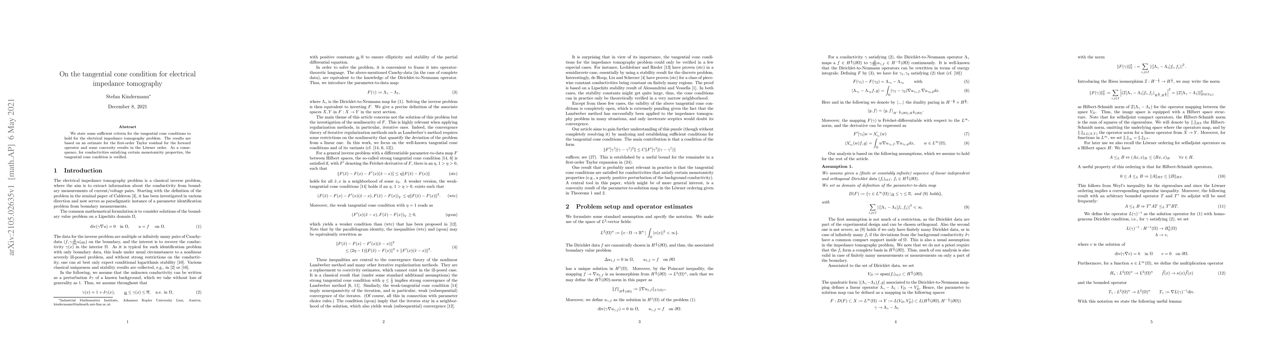 We state some sufficient criteria for the tangential cone conditions to hold for the electrical impedance tomography problem. The results are based on an estimate for the first-order Taylor residual for the forward operator and some convexity results in the L\"owner order. As a consequence, for conductivities satisfying certain monotonicity properties, the tangential cone condition is verified.