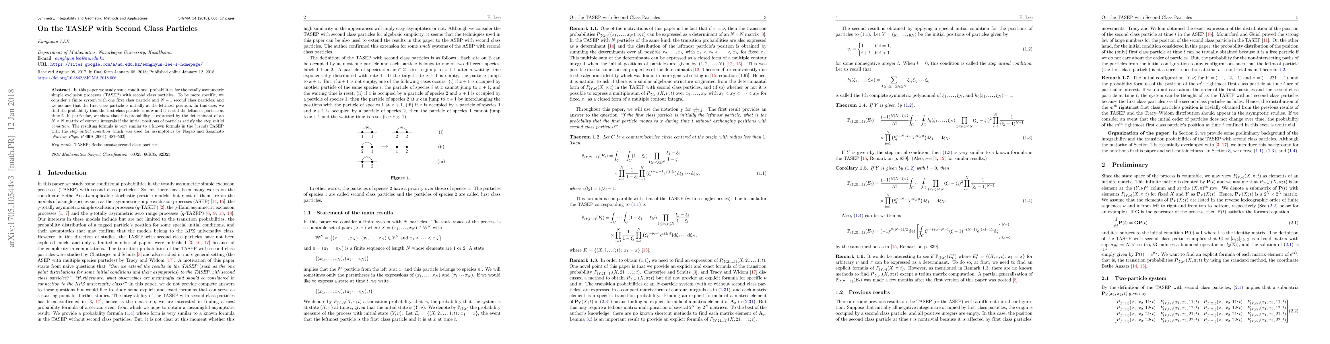 This paper investigates conditional probabilities in TASEP with second class particles, focusing on a system with one first class particle and $N-1$ second class particles. It derives a determinant formula for the probability that the first class particle remains the leftmost at time $t$, similar to a known formula in standard TASEP.