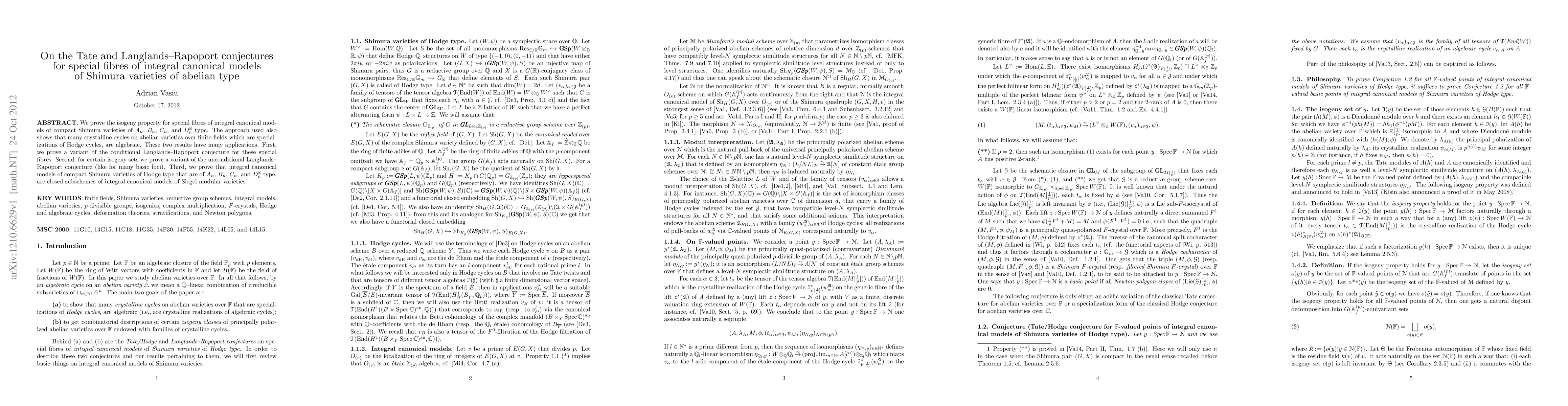 We prove the isogeny property for special fibres of integral canonical models of compact Shimura varieties of $A_n$, $B_n$, $C_n$, and $D_n^{\dbR}$ type. The approach used also shows that many crystalline cycles on abelian varieties over finite fields which are specializations of Hodge cycles, are algebraic. These two results have many applications. First, we prove a variant of the conditional Langlands--Rapoport conjecture for these special fibres. Second, for certain isogeny sets we prove a variant of the unconditional Langlands--Rapoport conjecture (like for many basic loci). Third, we prove that integral canonical models of compact Shimura varieties of Hodge type that are of $A_n$, $B_n$, $C_n$, and $D_n^{\dbR}$ type, are closed subschemes of integral canonical models of Siegel modular varieties.