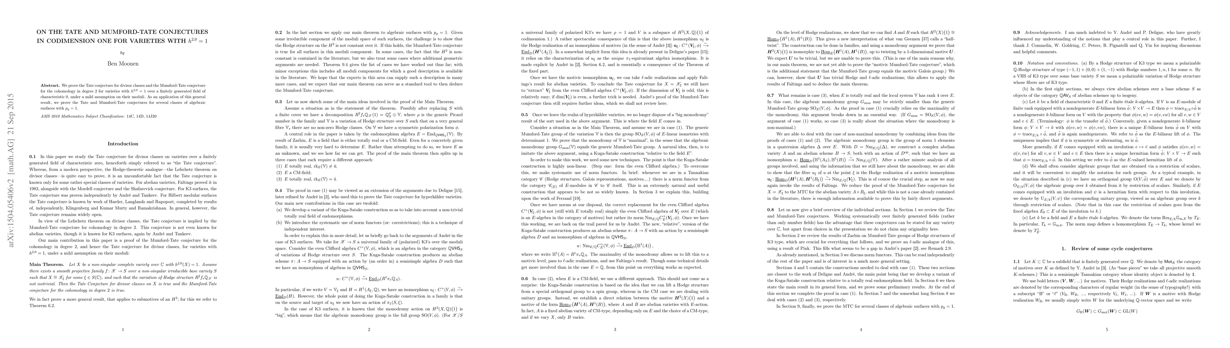 Summary: The paper proves the Tate and Mumford-Tate conjectures for divisor classes and degree 2 cohomology in varieties with $h^{2,0}=1$ over a characteristic 0 field, applying the results to certain algebraic surfaces with $p_g=1$.