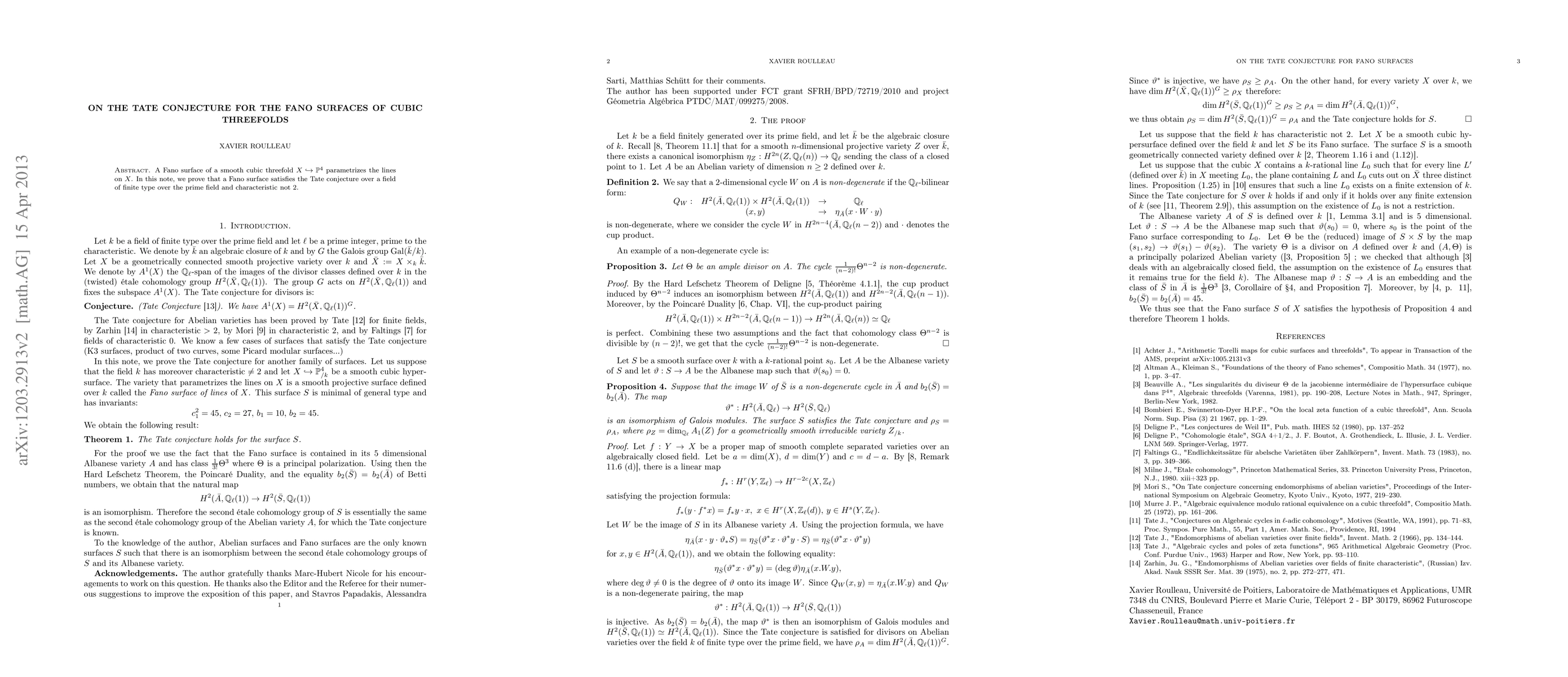 This paper proves that a Fano surface of a cubic threefold satisfies the Tate conjecture over fields of finite type, with implications for algebraic geometry in characteristic not 2.