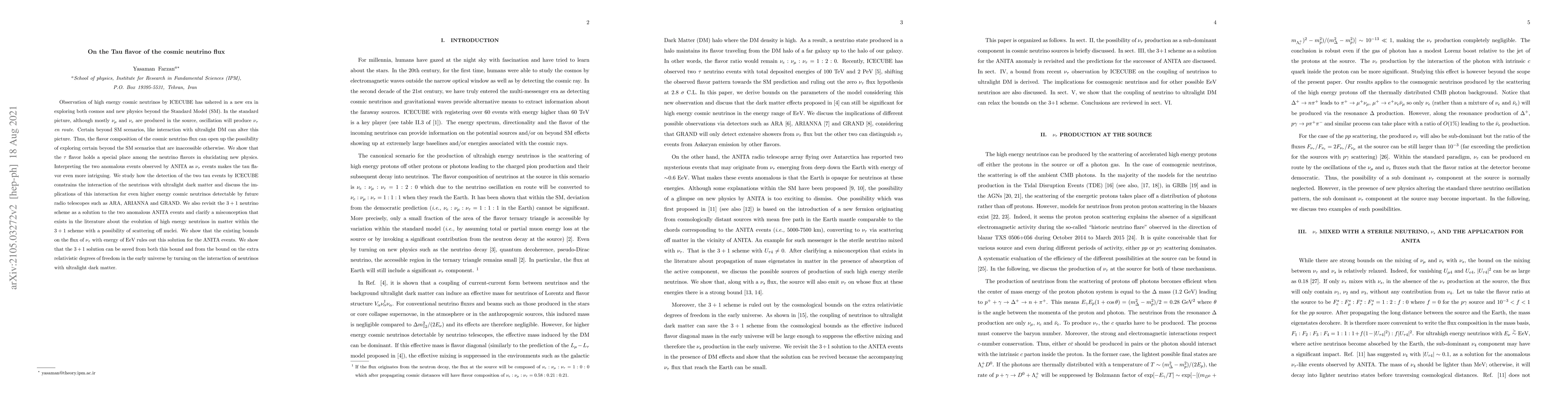 Observation of high energy cosmic neutrinos by ICECUBE has ushered in a new era in exploring both cosmos and new physics beyond the Standard Model (SM). In the standard picture, although mostly $\nu_\mu$ and $\nu_e$ are produced in the source, oscillation will produce $\nu_\tau$ {\it en route}. Certain beyond SM scenarios, like interaction with ultralight DM can alter this picture. Thus, the flavor composition of the cosmic neutrino flux can open up the possibility of exploring certain beyond the SM scenarios that are inaccessible otherwise. We show that the $\tau$ flavor holds a special place among the neutrino flavors in elucidating new physics. Interpreting the two anomalous events observed by ANITA as $\nu_\tau$ events makes the tau flavor even more intriguing. We study how the detection of the two tau events by ICECUBE constrains the interaction of the neutrinos with ultralight dark matter and discuss the implications of this interaction for even higher energy cosmic neutrinos detectable by future radio telescopes such as ARA, ARIANNA and GRAND. We also revisit the $3+1$ neutrino scheme as a solution to the two anomalous ANITA events and clarify a misconception that exists in the literature about the evolution of high energy neutrinos in matter within the $3+1$ scheme with a possibility of scattering off nuclei. We show that the existing bounds on the flux of $\nu_\tau$ with energy of EeV rules out this solution for the ANITA events. We show that the $3+1$ solution can be saved from both this bound and from the bound on the extra relativistic degrees of freedom in the early universe by turning on the interaction of neutrinos with ultralight dark matter.