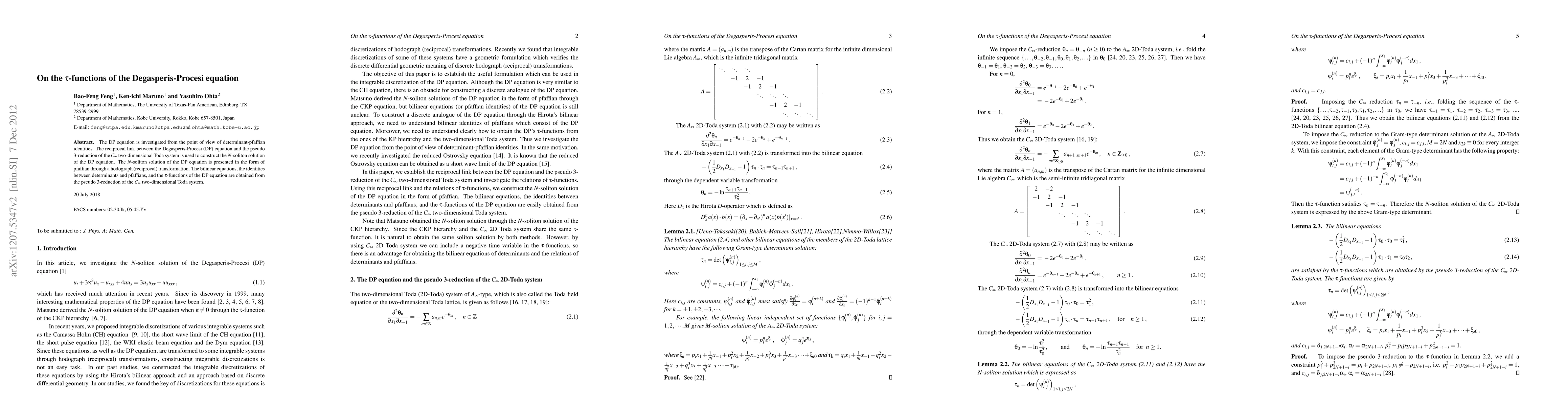 This paper explores the Degasperis-Procesi (DP) equation through determinant-pfaffian identities, constructing its N-soliton solution via a hodograph transformation. It derives the bilinear equations and $\tau$-functions from the pseudo 3-reduction of the $C_{\infty}$ two-dimensional Toda system.