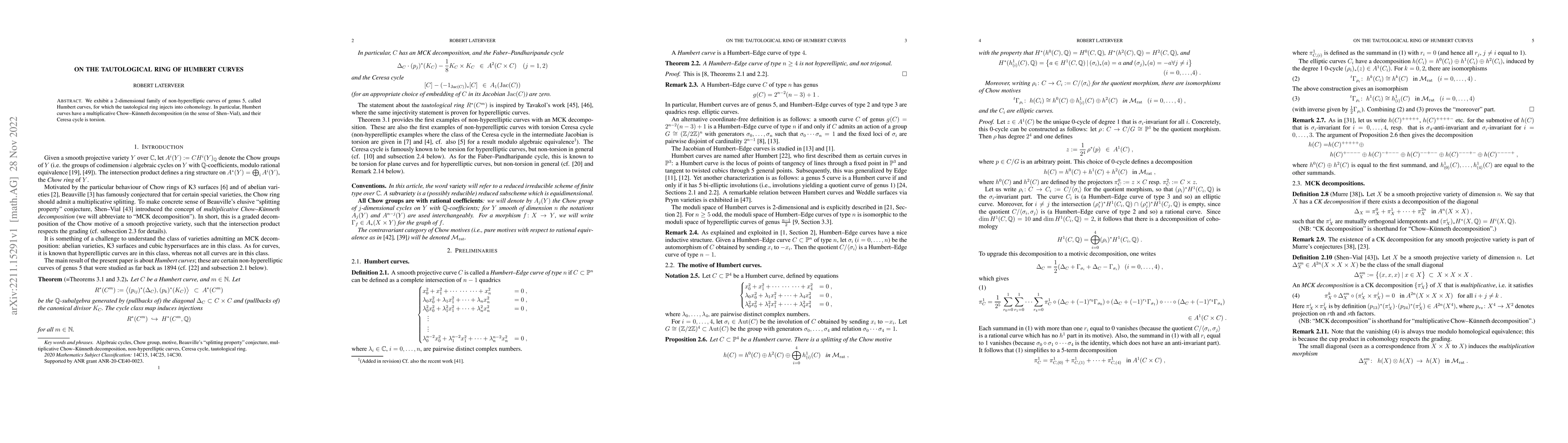 This paper explores Humbert curves, a 2-dimensional family of genus 5 non-hyperelliptic curves, demonstrating that their tautological ring injects into cohomology and possesses a multiplicative Chow-Künneth decomposition, while their Ceresa cycle is torsional.