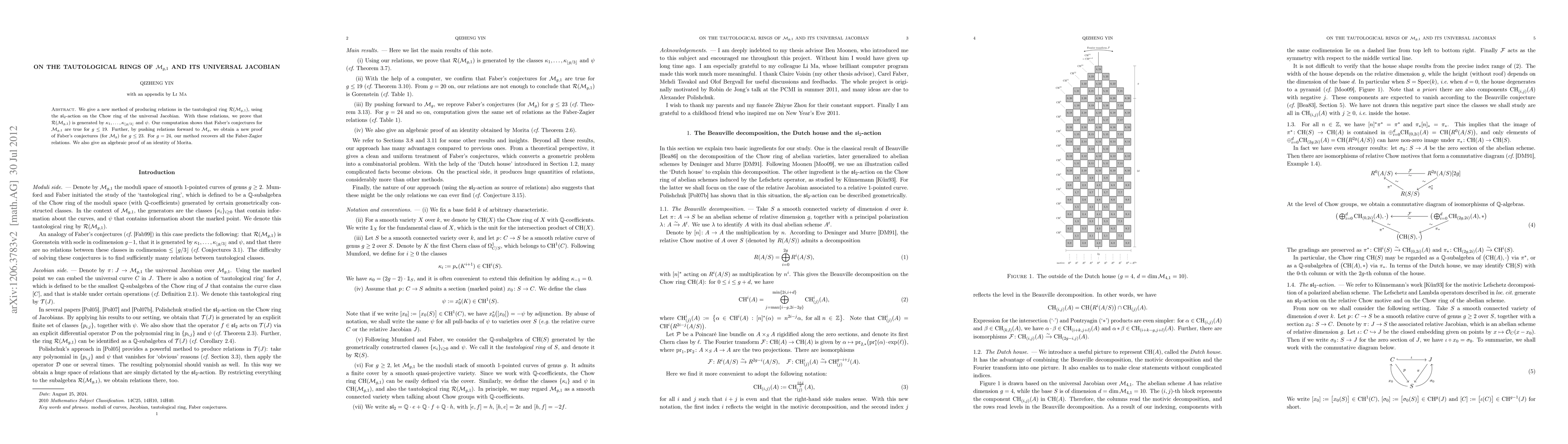 We give a new method of producing relations in the tautological ring R(M_{g, 1}), using the sl_2-action on the Chow ring of the universal Jacobian. With these relations, we prove that R(M_{g, 1}) is generated by \kappa_i for i no greater than g/3, together with \psi. Our computation shows that Faber's conjectures for M_{g, 1} are true for g up to 19. Further, by pushing relations forward to M_g, we obtain a new proof of Faber's conjectures (for M_g) for g up to 23. For g = 24, our method recovers all the Faber-Zagier relations. We also give an algebraic proof of an identity of Morita.