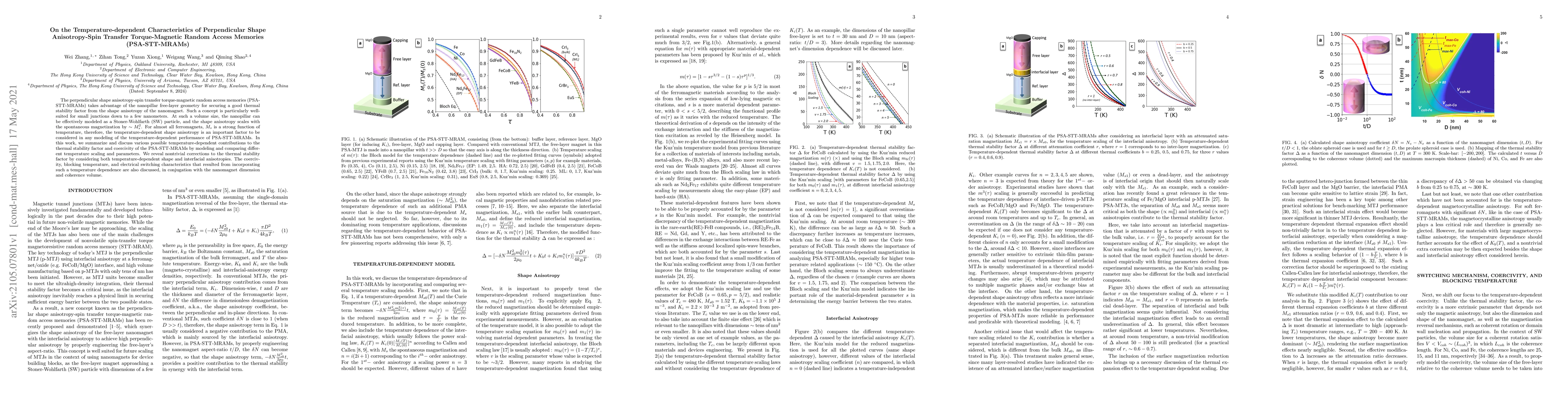 This paper investigates the temperature-dependent characteristics of perpendicular shape anisotropy-spin transfer torque magnetic random access memories (PSA-STT-MRAMs), focusing on thermal stability, coercivity, and electrical switching behavior. It highlights the importance of temperature-dependent shape and interfacial anisotropies in modeling the performance of PSA-STT-MRAMs.