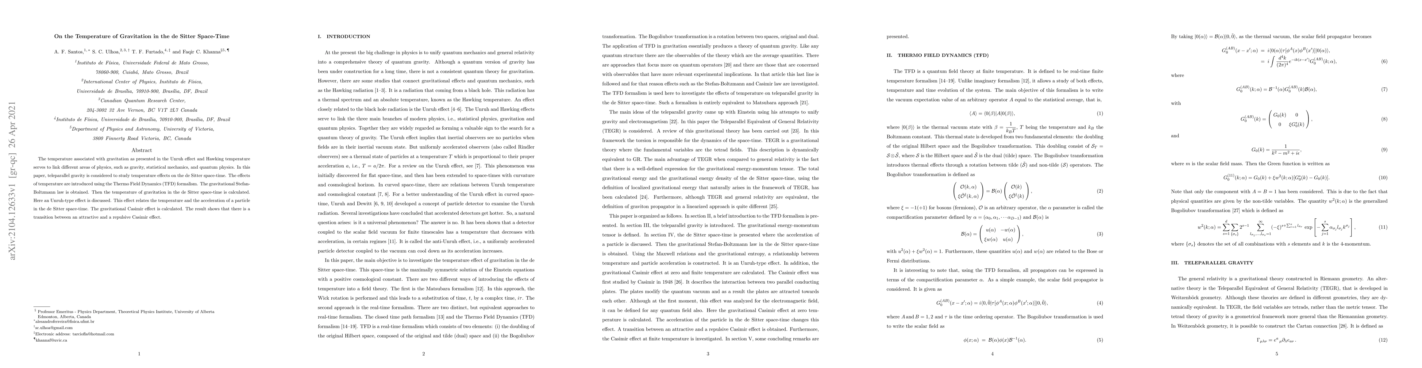 This paper explores the temperature of gravitation in de Sitter space-time using teleparallel gravity and Thermo Field Dynamics, deriving a gravitational Stefan-Boltzmann law and an Unruh-type effect relating temperature to particle acceleration, while also revealing a transition in the gravitational Casimir effect.