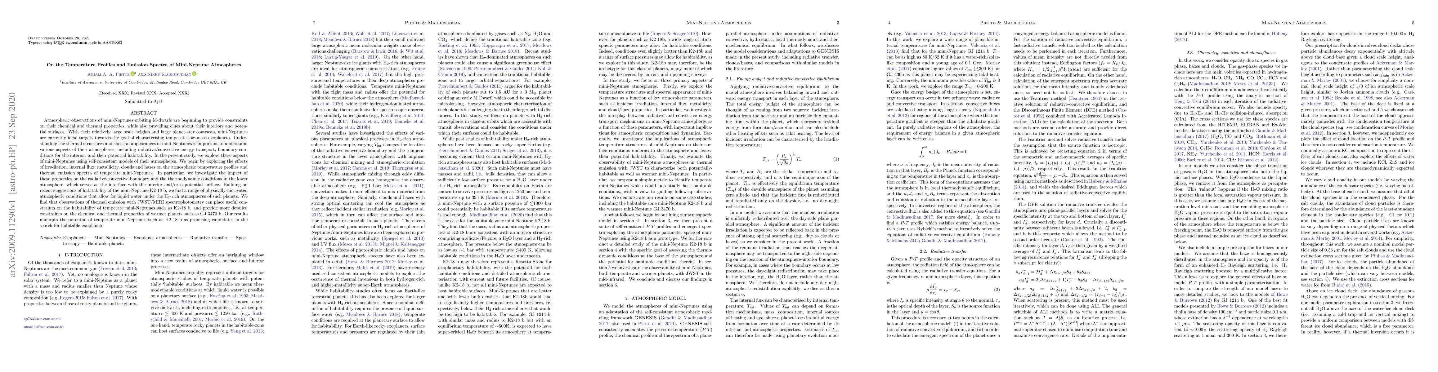 Atmospheric observations of mini-Neptunes orbiting M-dwarfs are beginning to provide constraints on their chemical and thermal properties, while also providing clues about their interiors and potential surfaces. With their relatively large scale heights and large planet-star contrasts, mini-Neptunes are currently ideal targets towards the goal of characterising temperate low-mass exoplanets. Understanding the thermal structures and spectral appearances of mini-Neptunes is important to understand various aspects of their atmospheres, including radiative/convective energy transport, boundary conditions for the interior, and their potential habitability. In the present study, we explore these aspects of mini-Neptunes using self-consistent models of their atmospheres. We begin by exploring the effects of irradiation, internal flux, metallicity, clouds and hazes on the atmospheric temperature profiles and thermal emission spectra of temperate mini-Neptunes. In particular, we investigate the impact of these properties on the radiative-convective boundary and the thermodynamic conditions in the lower atmosphere, which serves as the interface with the interior and/or a potential surface. Building on recent suggestions of habitability of the mini-Neptune K2-18 b, we find a range of physically-motivated atmospheric conditions that allow for liquid water under the H_2-rich atmospheres of such planets. We find that observations of thermal emission with JWST/MIRI spectrophotometry can place useful constraints on the habitability of temperate mini-Neptunes such as K2-18 b, and provide more detailed constraints on the chemical and thermal properties of warmer planets such as GJ 3470 b. Our results underpin the potential of temperate mini-Neptunes such as K2-18 b as promising candidates in the search for habitable exoplanets.