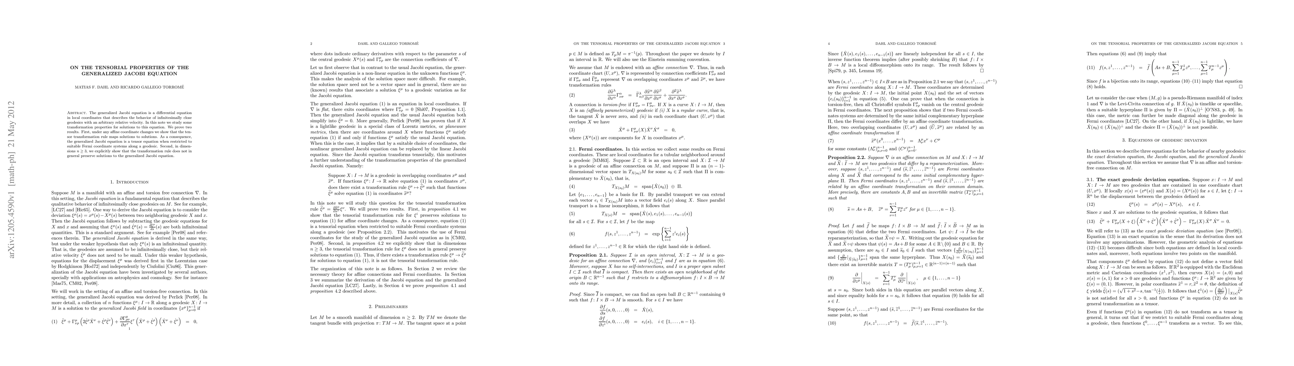 The generalized Jacobi equation is a differential equation in local coordinates that describes the behavior of infinitesimally close geodesics with an arbitrary relative velocity. In this note we study some transformation properties for solutions to this equation. We prove two results. First, under any affine coordinate changes we show that the tensor transformation rule maps solutions to solutions. As a consequence, the generalized Jacobi equation is a tensor equation when restricted to suitable Fermi coordinate systems along a geodesic. Second, in dimensions n\ge 3, we explicitly show that the transformation rule does not in general preserve solutions to the generalized Jacobi equation.