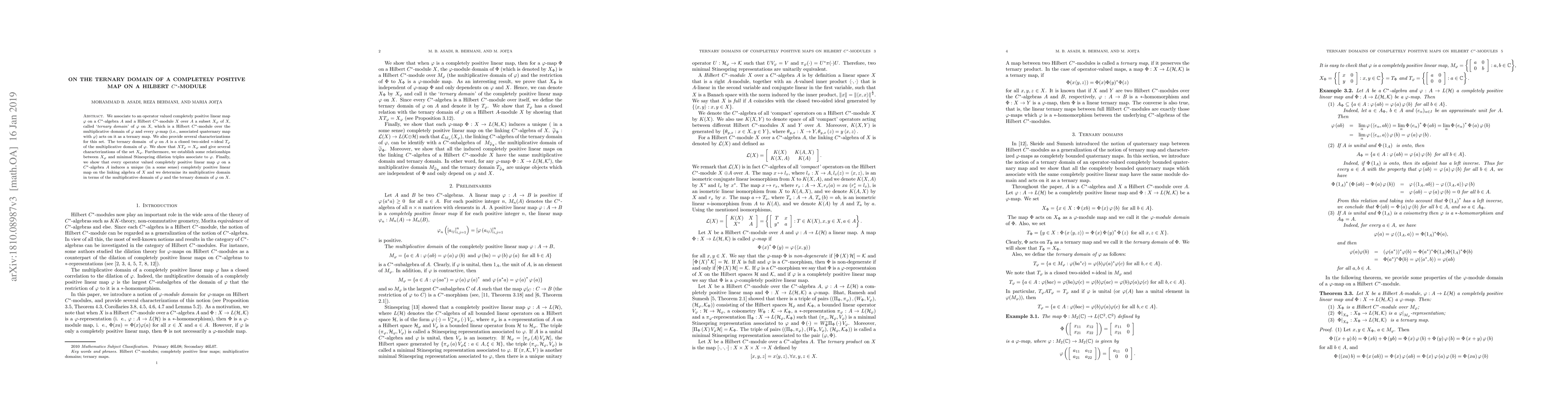We associate to an operator valued completely positive linear map $\varphi$ on a $C^{\ast }$-algebra $A$ and a Hilbert $C^{\ast }$-module $X$ over $A$ a subset $X_{\varphi }$ of $X,$ called '\textit{ternary domain}' of $\varphi$ on $X,$ which is a Hilbert $C^{\ast }$-module over the multiplicative domain of $\varphi $ and every $\varphi $-map (i.e., associated quaternary map with $\varphi $) acts on it as a ternary map. We also provide several characterizations for this set. The ternary domain \ of $\varphi $ on $A\ $ is a closed two-sided $\ast $-ideal $T_{\varphi }$ of the multiplicative domain of $\varphi $. We show that $XT_{\varphi }=X_{\varphi }$ and give several characterizations of the set $X_{\varphi }.$ Furthermore, we establish some relationships between $X_{\varphi }$ and minimal Stinespring dilation triples associate to $\varphi $. Finally, we show that every operator valued completely positive linear map $\varphi $ on a $C^{\ast }$ -algebra $A$ induces a unique (in a some sense) completely positive linear map on the linking algebra of $X$ and we determine its multiplicative domain in terms of the multiplicative domain of $\varphi $ and the ternary domain of $\varphi $ on $X$.