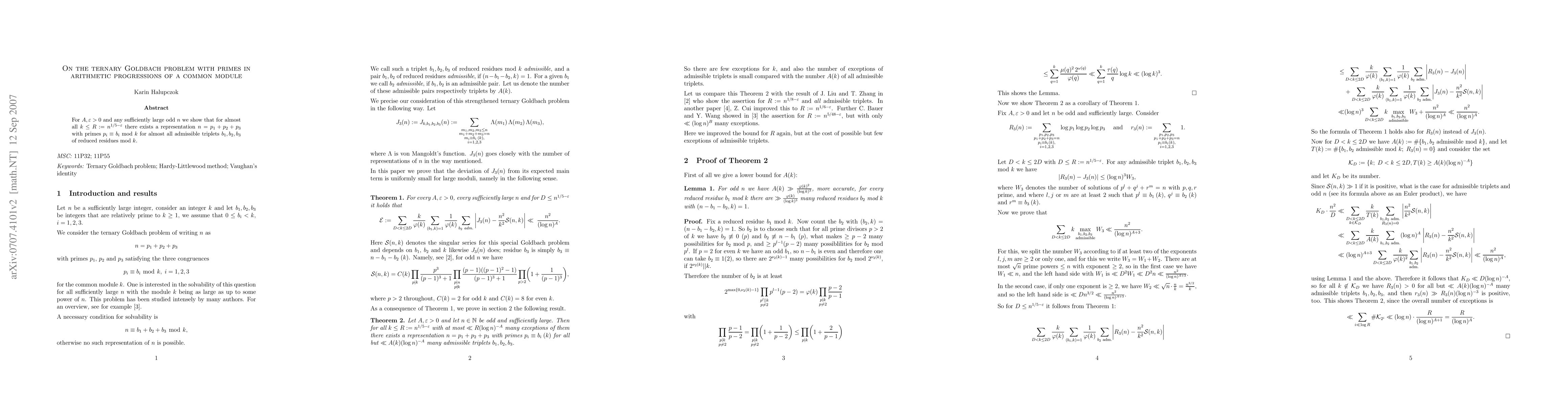 For A,epsilon>0 and any sufficiently large odd n we show that for almost all k up to n^{1/5-epsilon} there exists a representation n=p1+p2+p3 with primes in residue classes b1,b2,b3 mod k for almost all admissible triplets b1,b2,b3 of reduced residues mod k.