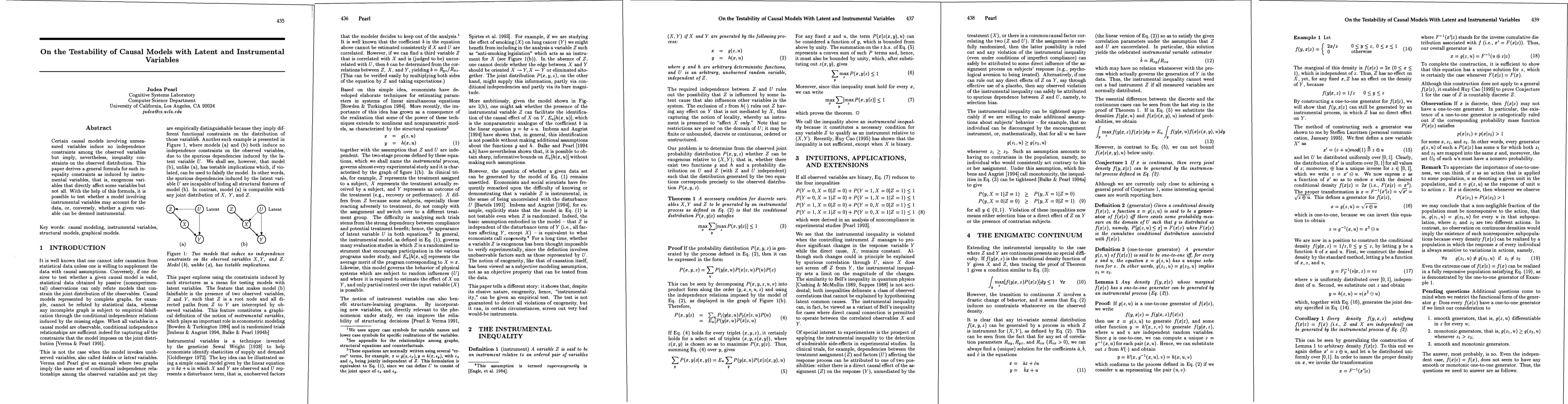 Certain causal models involving unmeasured variables induce no independence constraints among the observed variables but imply, nevertheless, inequality contraints on the observed distribution. This paper derives a general formula for such instrumental variables, that is, exogenous variables that directly affect some variables but not all. With the help of this formula, it is possible to test whether a model involving instrumental variables may account for the data, or, conversely, whether a given variables can be deemed instrumental.