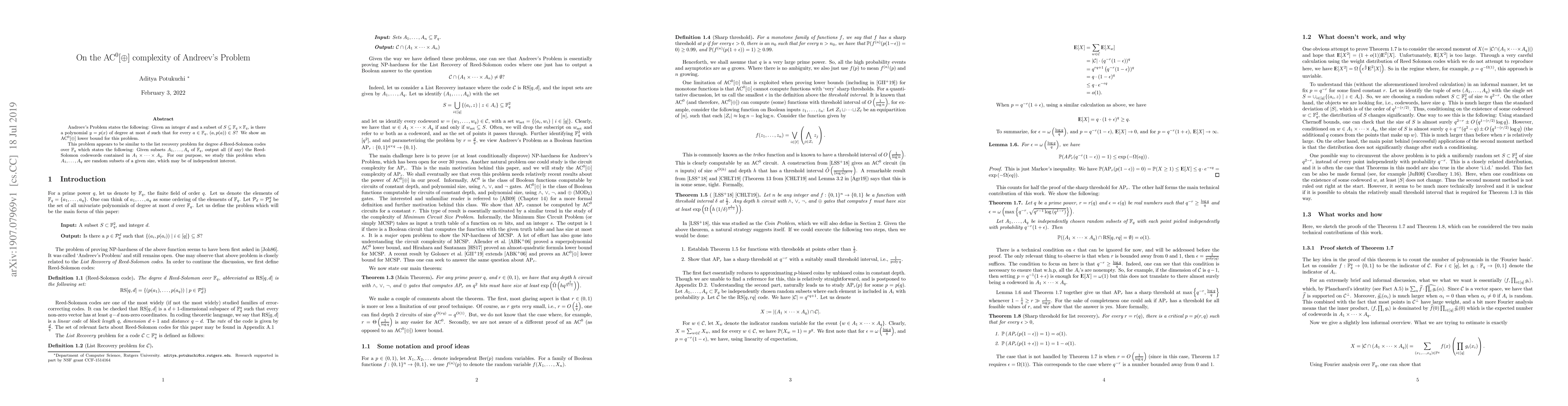 Andreev's Problem states the following: Given an integer $d$ and a subset of $S \subseteq \mathbb{F}_q \times \mathbb{F}_q$, is there a polynomial $y = p(x)$ of degree at most $d$ such that for every $a \in \mathbb{F}_q$, $(a,p(a)) \in S$? We show an $\text{AC}^0[\oplus]$ lower bound for this problem. This problem appears to be similar to the list recovery problem for degree $d$-Reed-Solomon codes over $\mathbb{F}_q$ which states the following: Given subsets $A_1,\ldots,A_q$ of $\mathbb{F}_q$, output all (if any) the Reed-Solomon codewords contained in $A_1\times \cdots \times A_q$. For our purpose, we study this problem when $A_1, \ldots, A_q$ are random subsets of a given size, which may be of independent interest.