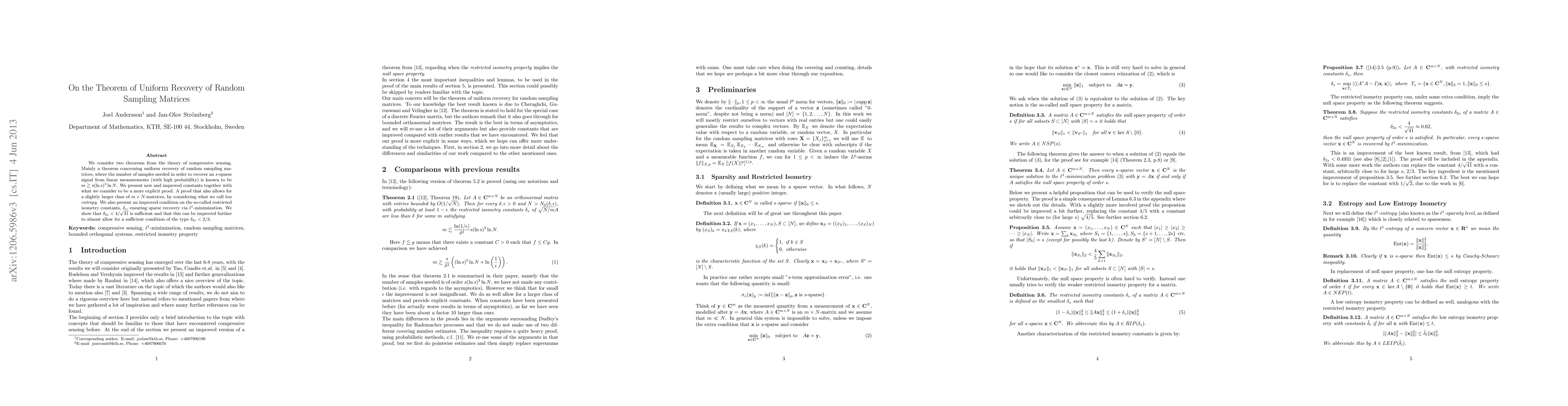 We consider two theorems from the theory of compressive sensing. Mainly a theorem concerning uniform recovery of random sampling matrices, where the number of samples needed in order to recover an $s$-sparse signal from linear measurements (with high probability) is known to be $m\gtrsim s(\ln s)^3\ln N$. We present new and improved constants together with what we consider to be a more explicit proof. A proof that also allows for a slightly larger class of $m\times N$-matrices, by considering what we call \emph{low entropy}. We also present an improved condition on the so-called restricted isometry constants, $\delta_s$, ensuring sparse recovery via $\ell^1$-minimization. We show that $\delta_{2s}<4/\sqrt{41}$ is sufficient and that this can be improved further to almost allow for a sufficient condition of the type $\delta_{2s}<2/3$.
