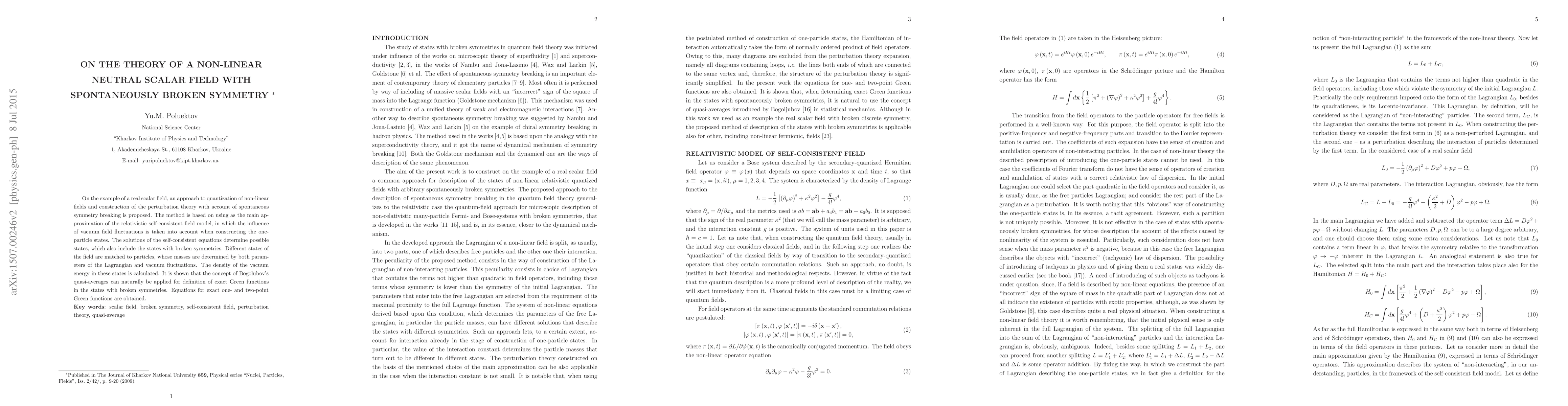 This paper proposes a method for quantizing non-linear neutral scalar fields, incorporating spontaneous symmetry breaking. It utilizes a relativistic self-consistent field model to account for vacuum fluctuations and derives equations for exact one- and two-point Green functions in states with broken symmetries.