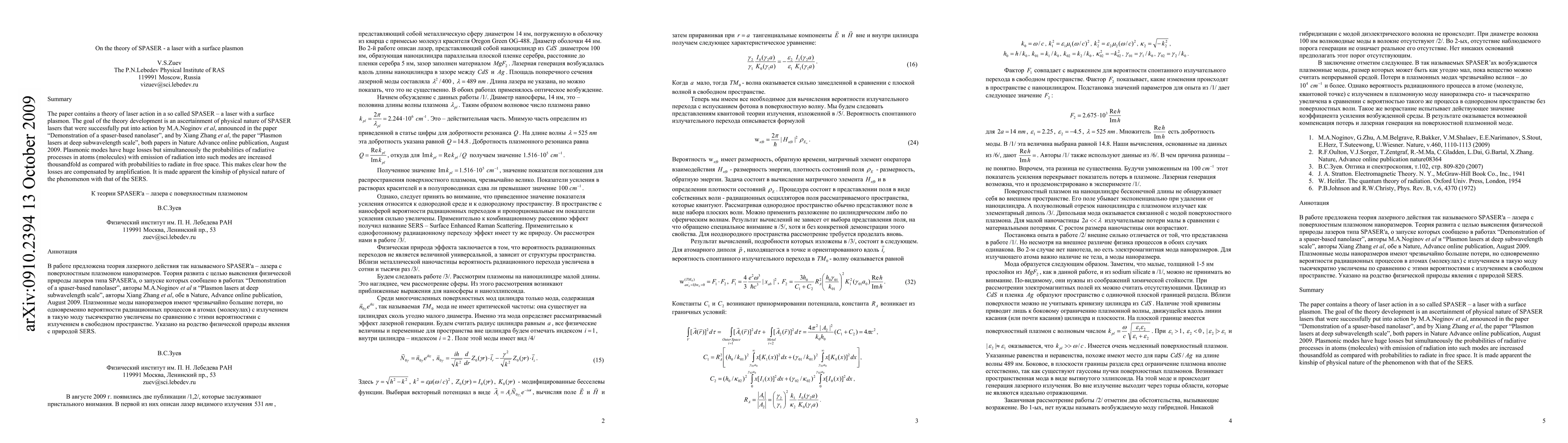 The paper contains a theory of laser action in a so called SPASER, a laser with a surface plasmon. The goal of the theory development is an ascertainment of physical nature of SPASER lasers that were successfully put into action by M. A. Noginov et al, announced in the paper entitled Demonstration of a spaser-based nanolaser, and by Xiang Zhang et al, the paper Plasmon lasers at deep subwavelength scale, both papers in Nature Advance online publication, August 2009. Plasmonic modes have huge losses but simultaneously the probabilities of radiative processes in atoms (molecules) with emission of radiation into such modes are increased thousandfold as compared with probabilities to radiate in free space. This makes clear how the losses are compensated by amplification. It is made apparent the kinship of physical nature of the phenomenon with that of of the SERS.