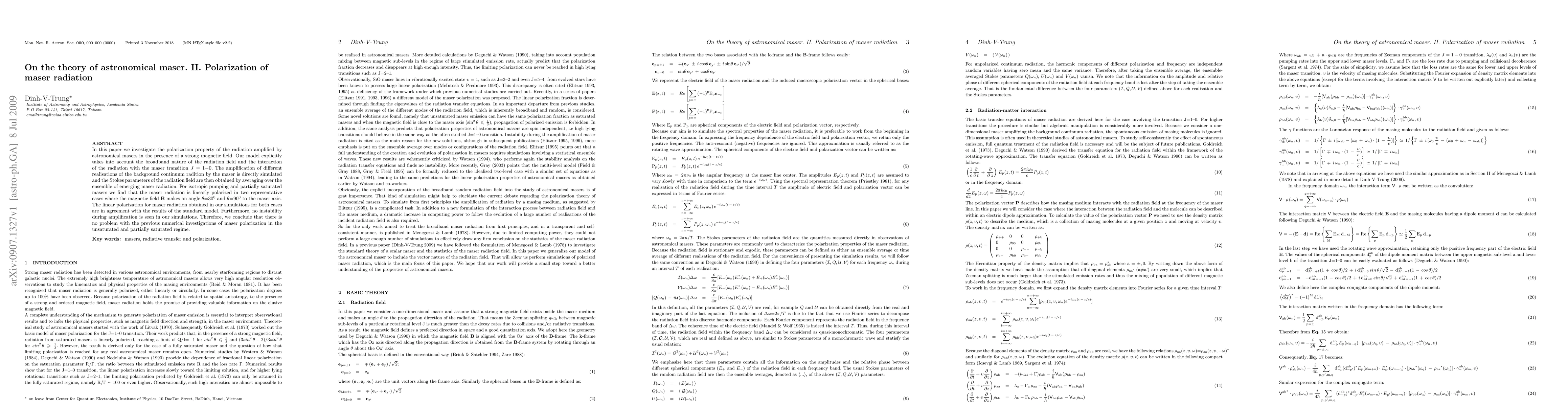 This paper investigates the polarization of radiation amplified by astronomical masers under strong magnetic fields, finding linear polarization in two specific cases. The simulations confirm the standard model results and show no amplification instabilities, validating previous numerical investigations.
