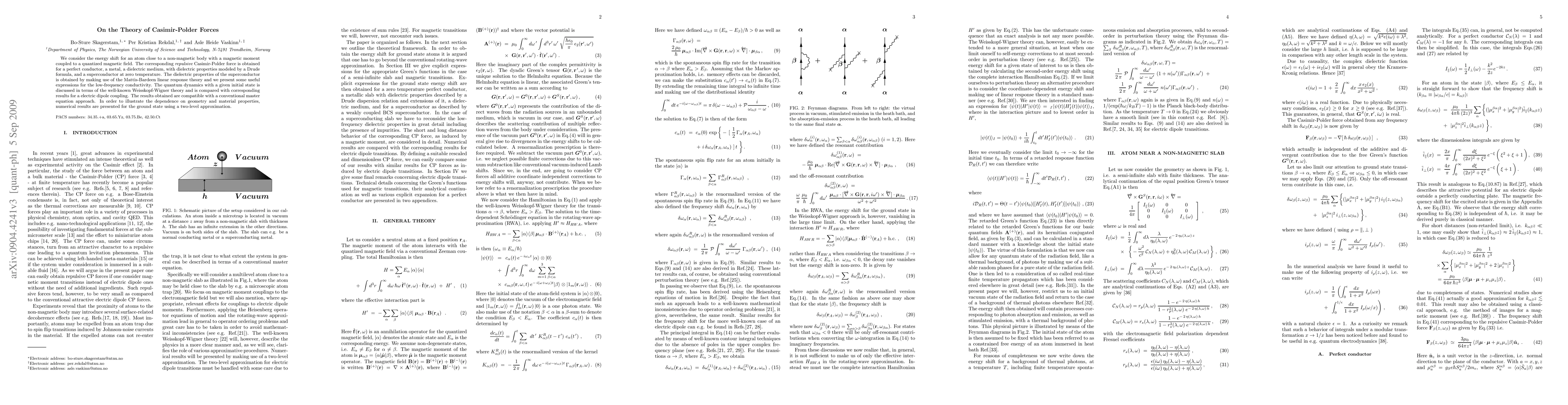 This paper investigates the energy shift and repulsive Casimir-Polder forces for an atom near various materials (perfect conductor, metal, dielectric, superconductor) interacting with a quantized magnetic field. It utilizes Mattis-Bardeen theory for superconductors and compares the results with electric dipole coupling, concluding with numerical results illustrating the effect of geometry and material properties.