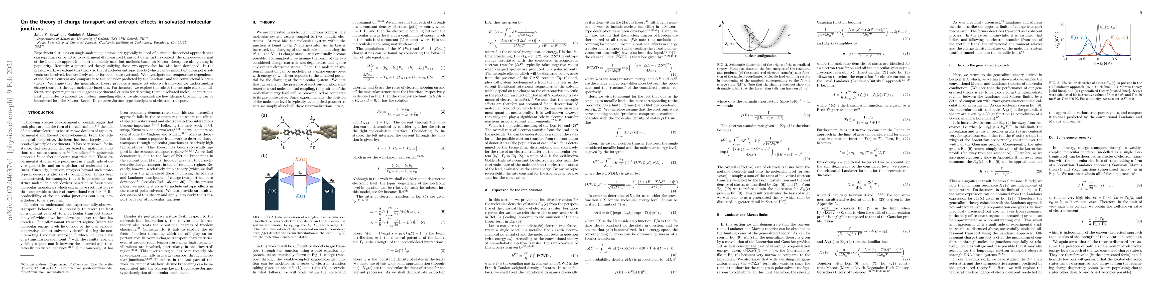 This paper extends a generalized theory unifying Landauer and Marcus approaches to include entropic effects, particularly relevant in solvated molecular junctions, and compares its predictions to those of traditional theories. It highlights the importance of entropic effects in charge transport and proposes experimental criteria for detecting them.