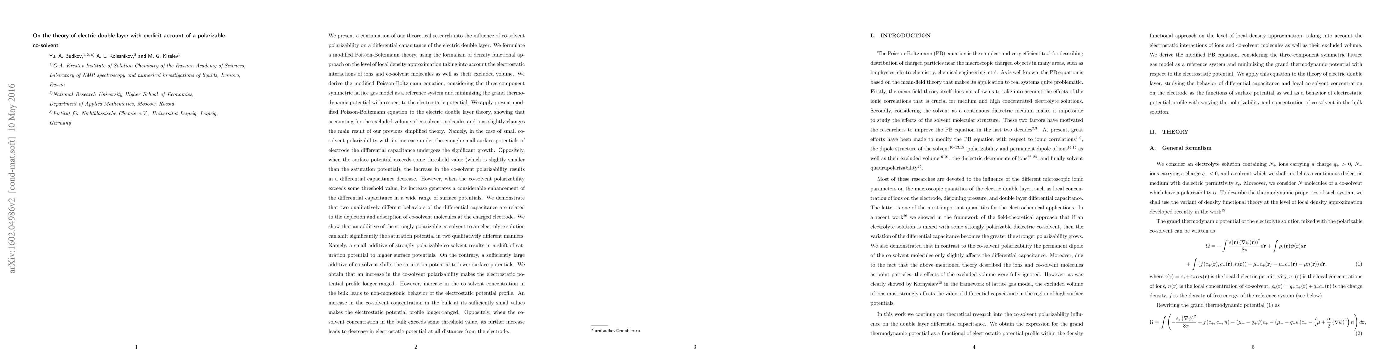 This paper develops a modified Poisson-Boltzmann theory to account for the polarizability of a co-solvent in the electric double layer, deriving a new equation that considers electrostatic interactions and excluded volume, and applies it to electric double layer theory.