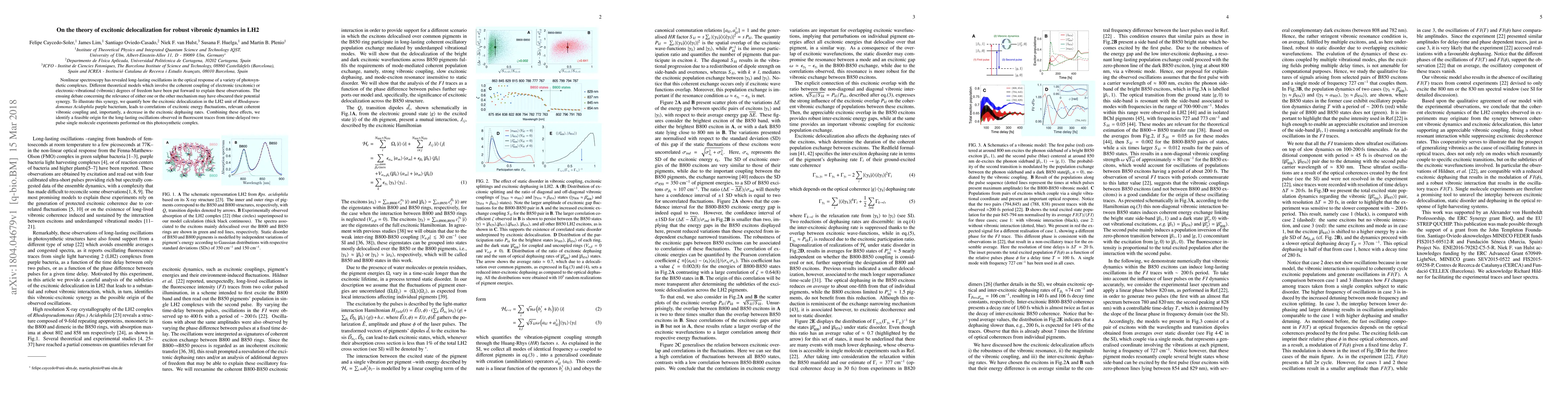 Nonlinear spectroscopy has revealed long-lasting oscillations in the optical response of a variety of photosynthetic complexes. Different theoretical models which involve the coherent coupling of electronic (excitonic) or electronic-vibrational (vibronic) degrees of freedom have been put forward to explain these observations. The ensuing debate concerning the relevance of either one or the other mechanism may have obscured their potential synergy. To illustrate this synergy, we quantify how the excitonic delocalization in the LH2 unit of Rhodopseudomonas Acidophila purple bacterium, leads to correlations of excitonic energy fluctuations, relevant coherent vibronic coupling and, importantly, a decrease in the excitonic dephasing rates. Combining these effects, we identify a feasible origin for the long-lasting oscillations observed in fluorescent traces from time-delayed two-pulse single molecule experiments performed on this photosynthetic complex.