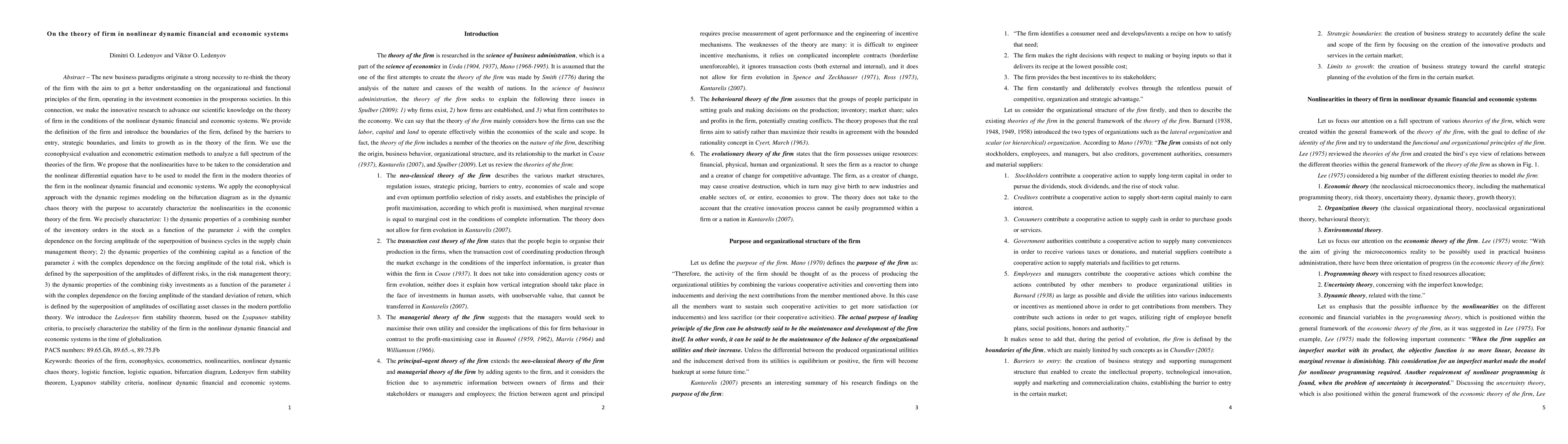 The new business paradigms originate a strong necessity to re-think the theory of the firm with the aim to get a better understanding on the organizational and functional principles of the firm, operating in the investment economies in the prosperous societies. In this connection, we make the innovative research to advance our scientific knowledge on the theory of firm in the conditions of the nonlinear dynamic financial and economic systems. We propose that the nonlinearities have to be taken to the consideration and the nonlinear differential equation have to be used to model the firm in the modern theories of the firm in the nonlinear dynamic financial and economic systems. We apply the econophysical approach with the dynamic regimes modeling on the bifurcation diagram as in the dynamic chaos theory with the purpose to accurately characterize the nonlinearities in the economic theory of the firm. We introduce the Ledenyov firm stability theorem, based on the Lyapunov stability criteria, to precisely characterize the stability of the firm in the nonlinear dynamic financial and economic systems in the time of globalization.