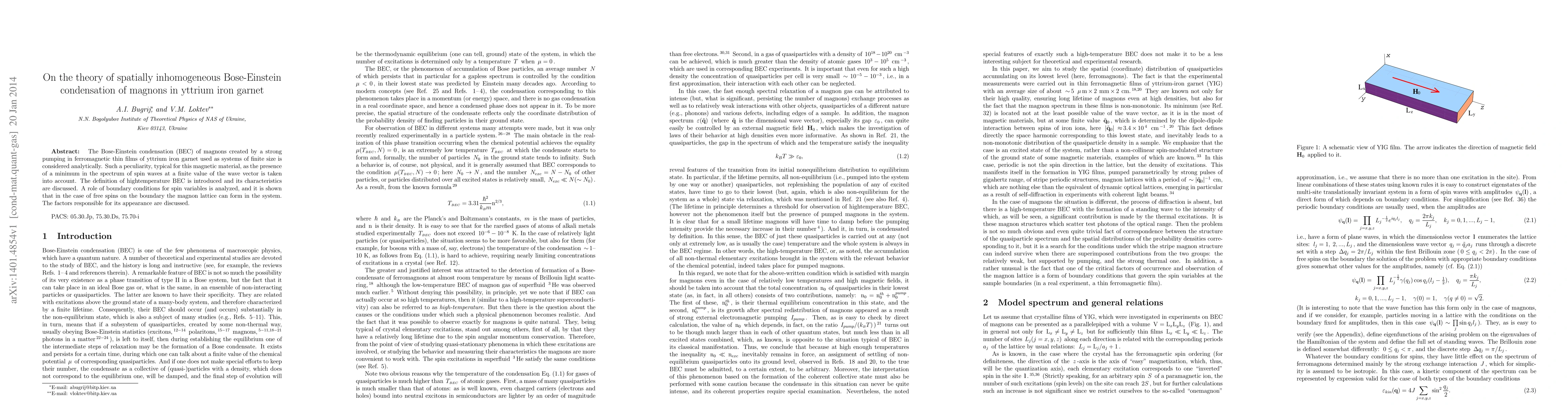 This paper analytically explores the inhomogeneous Bose-Einstein condensation (BEC) of magnons in yttrium iron garnet thin films under strong pumping. It introduces the concept of high-temperature BEC and discusses the influence of boundary conditions on the formation of a magnon lattice, particularly when spins are free on the boundary.