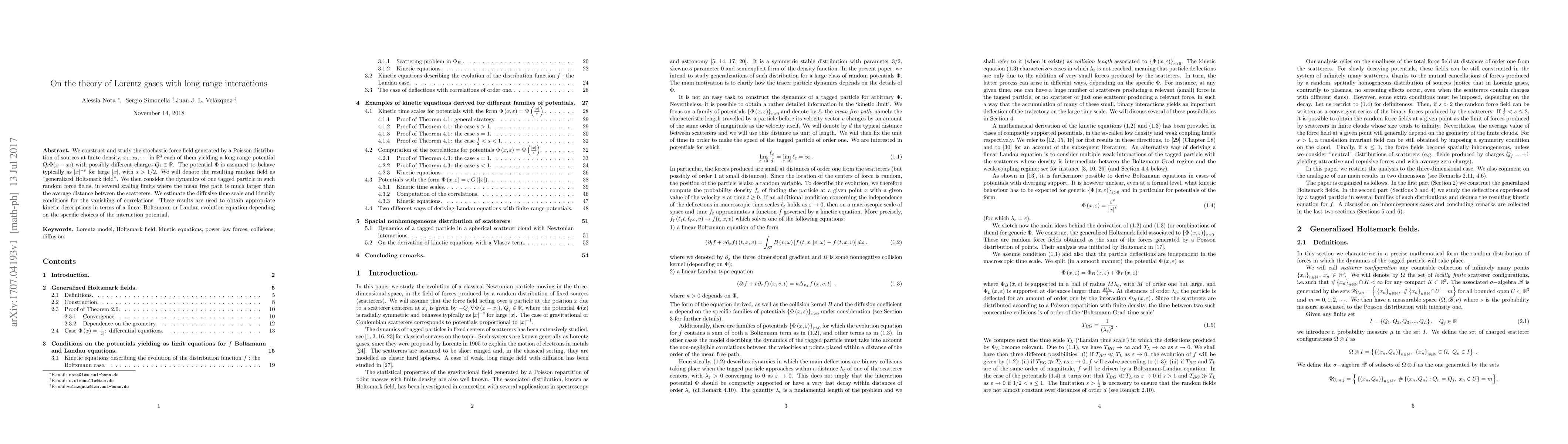 We construct and study the stochastic force field generated by a Poisson distribution of sources at finite density, $x_1,x_2,\cdots$ in $\mathbb{R}^3$ each of them yielding a long range potential $Q_i\Phi(x-x_i)$ with possibly different charges $Q_i \in \mathbb{R}$. The potential $\Phi$ is assumed to behave typically as $|x|^{-s}$ for large $|x|$, with $s > 1/2$. We will denote the resulting random field as "generalized Holtsmark field". We then consider the dynamics of one tagged particle in such random force fields, in several scaling limits where the mean free path is much larger than the average distance between the scatterers. We estimate the diffusive time scale and identify conditions for the vanishing of correlations. These results are used to obtain appropriate kinetic descriptions in terms of a linear Boltzmann or Landau evolution equation depending on the specific choices of the interaction potential.