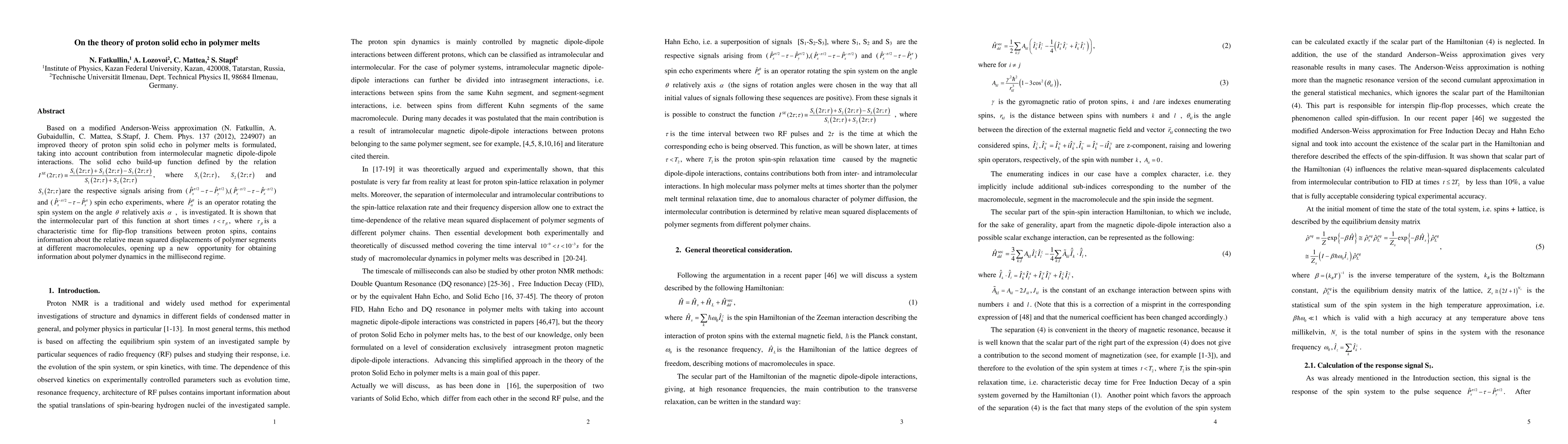 This paper develops an improved theory of proton spin solid echo in polymer melts using a modified Anderson-Weiss approximation, highlighting the role of intermolecular magnetic dipole-dipole interactions. It reveals that the intermolecular part of the solid echo build-up function provides insights into the relative mean squared displacements of polymer segments, offering new information on polymer dynamics in the millisecond regime.
