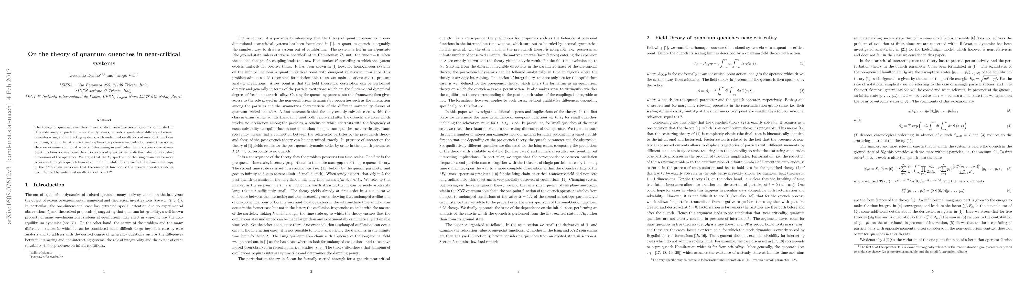The theory of quantum quenches in near-critical one-dimensional systems formulated in [J. Phys. A 47 (2014) 402001] yields analytic predictions for the dynamics, unveils a qualitative difference between non-interacting and interacting systems, with undamped oscillations of one-point functions occurring only in the latter case, and explains the presence and role of different time scales. Here we examine additional aspects, determining in particular the relaxation value of one-point functions for small quenches. For a class of quenches we relate this value to the scaling dimensions of the operators. We argue that the $E_8$ spectrum of the Ising chain can be more accessible through a quench than at equilibrium, while for a quench of the plane anisotropy in the XYZ chain we obtain that the one-point function of the quench operator switches from damped to undamped oscillations at $\Delta=1/2$.