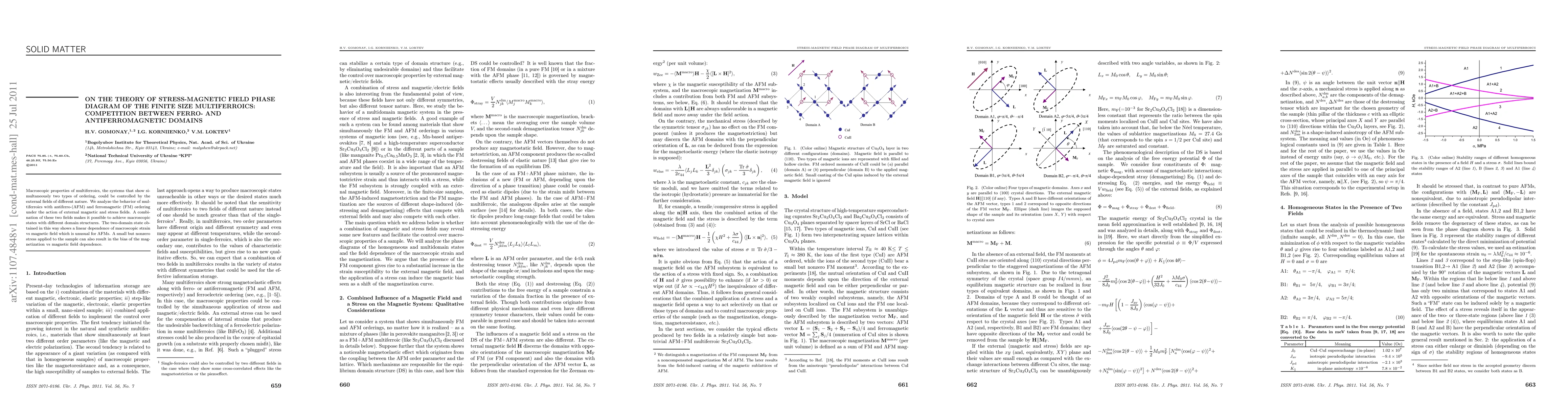 Macroscopic properties of multiferroics, the systems that show simultaneously two types of ordering, could be controlled by the external fields of different nature. We analyze the behavior of multiferroics with antiferro-(AFM) and ferromagnetic (FM) ordering under the action of external magnetic and stress fields. A combination of these two fields makes it possible to achieve macroscopic states with different domain structures. The two-domain state obtained in this way shows a linear dependence of macroscopic strain vs magnetic field which is unusual for AFMs. A small but nonzero stress applied to the sample can also result in the bias of the magnetization vs magnetic field dependence.