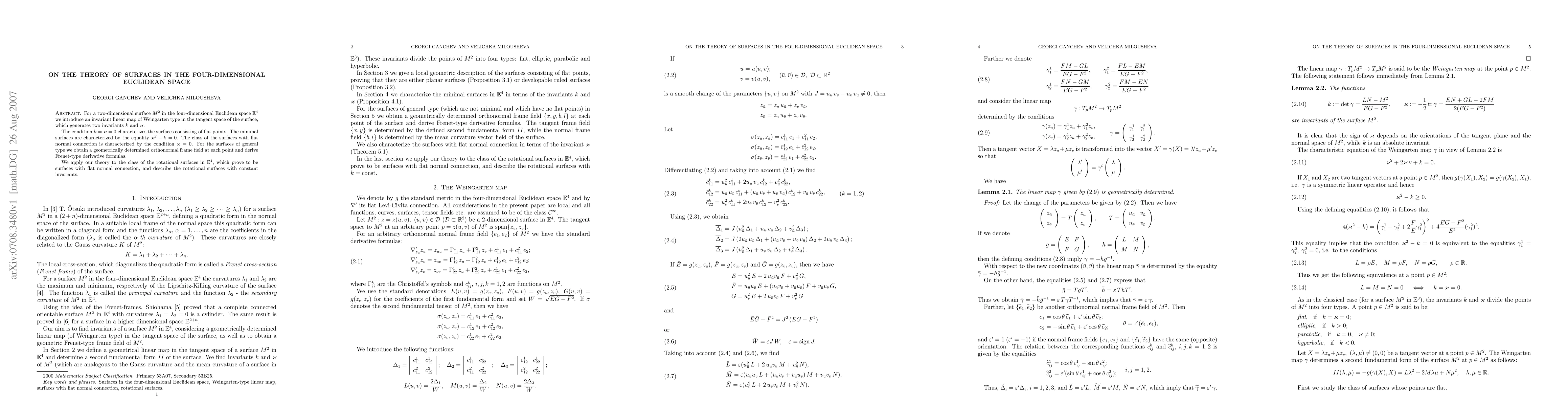 This paper introduces a new invariant linear map for two-dimensional surfaces in four-dimensional Euclidean space, generating invariants k and kappa. It characterizes flat surfaces, minimal surfaces, and surfaces with a flat normal connection, and provides a geometric orthonormal frame for general surfaces.