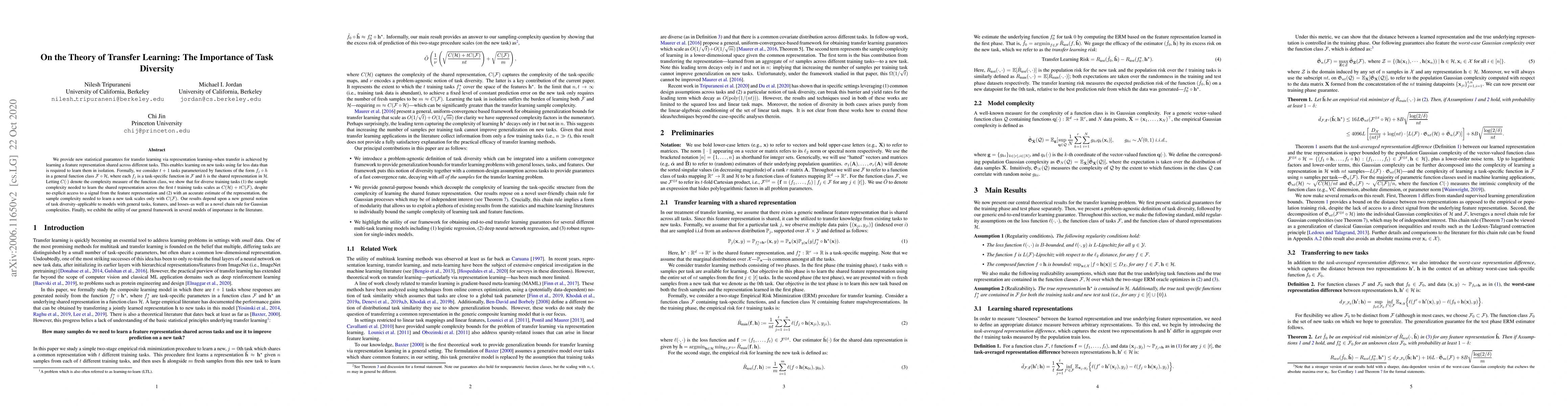 We provide new statistical guarantees for transfer learning via representation learning--when transfer is achieved by learning a feature representation shared across different tasks. This enables learning on new tasks using far less data than is required to learn them in isolation. Formally, we consider $t+1$ tasks parameterized by functions of the form $f_j \circ h$ in a general function class $\mathcal{F} \circ \mathcal{H}$, where each $f_j$ is a task-specific function in $\mathcal{F}$ and $h$ is the shared representation in $\mathcal{H}$. Letting $C(\cdot)$ denote the complexity measure of the function class, we show that for diverse training tasks (1) the sample complexity needed to learn the shared representation across the first $t$ training tasks scales as $C(\mathcal{H}) + t C(\mathcal{F})$, despite no explicit access to a signal from the feature representation and (2) with an accurate estimate of the representation, the sample complexity needed to learn a new task scales only with $C(\mathcal{F})$. Our results depend upon a new general notion of task diversity--applicable to models with general tasks, features, and losses--as well as a novel chain rule for Gaussian complexities. Finally, we exhibit the utility of our general framework in several models of importance in the literature.