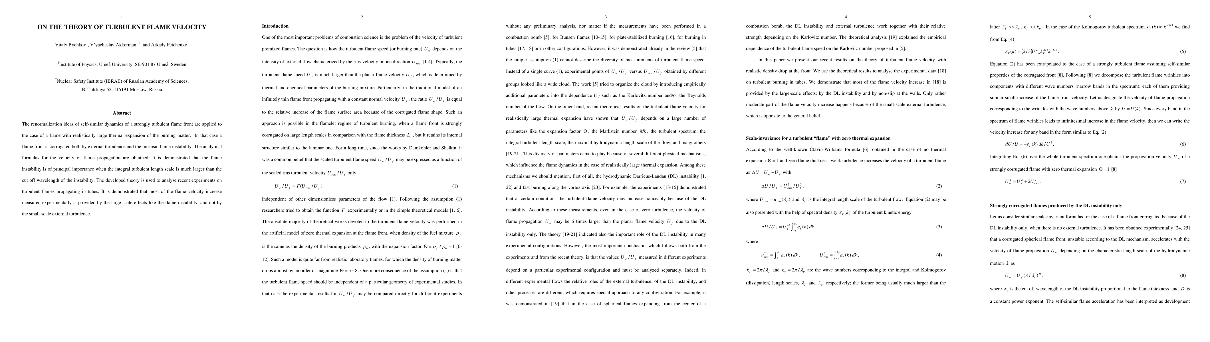 This paper applies renormalization theory to derive analytical formulas for turbulent flame velocity, emphasizing the importance of flame instability over small-scale external turbulence when the turbulent length scale is much larger than the instability's cutoff wavelength. The theory is validated against experimental data on turbulent flames in tubes.