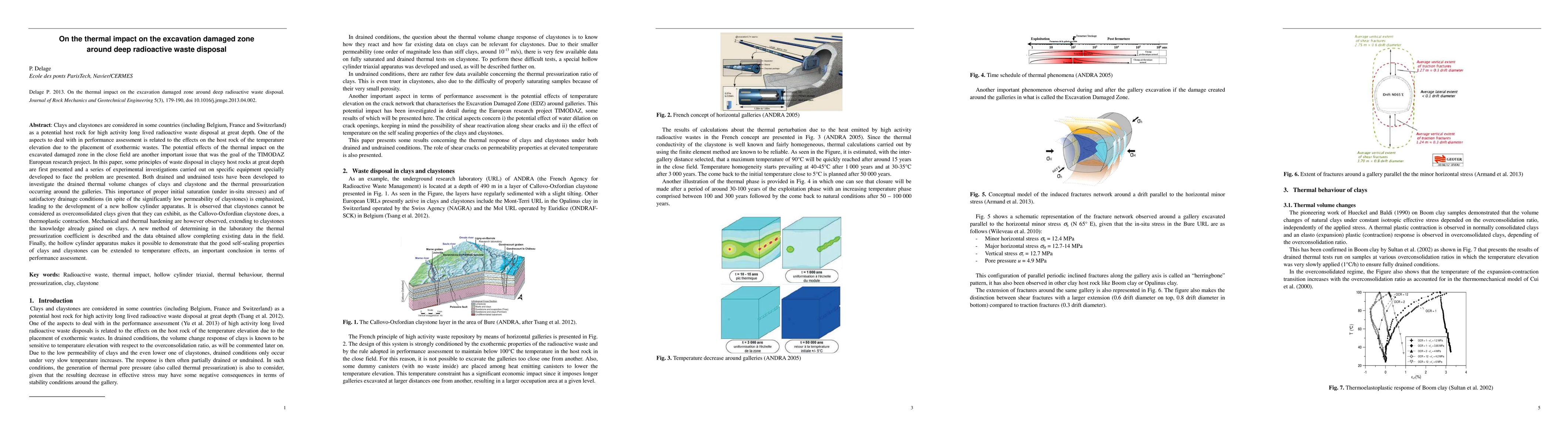 Clays and claystones are considered in some countries (including Belgium, France and Switzerland) as a potential host rock for high activity long lived radioactive waste disposal at great depth. One of the aspects to deal with in performance assessment is related to the effects on the host rock of the temperature elevation due to the placement of exothermic wastes. The potential effects of the thermal impact on the excavated damaged zone in the close field are another important issue that was the goal of the TIMODAZ European research project. In this paper, some principles of waste disposal in clayey host rocks at great depth are first presented and a series of experimental investigations carried out on specific equipment specially developed to face the problem are presented. Both drained and undrained tests have been developed to investigate the drained thermal volume changes of clays and claystone and the thermal pressurization occurring around the galleries. This importance of proper initial saturation (under in-situ stresses) and of satisfactory drainage conditions (in spite of the significantly low permeability of claystones) is emphasized, leading to the development of a new hollow cylinder apparatus. It is observed that claystones cannot be considered as overconsolidated clays given that they can exhibit, as the Callovo-Oxfordian claystone does, a thermoplastic contraction. Mechanical and thermal hardening are however observed, extending to claystones the knowledge already gained on clays. A new method of determining in the laboratory the thermal pressurization coefficient is described and the data obtained allow completing existing data in the field. Finally, the hollow cylinder apparatus makes it possible to demonstrate that the good self-sealing properties of clays and claystones can be extended to temperature effects, an important conclusion in terms of performance assessment.