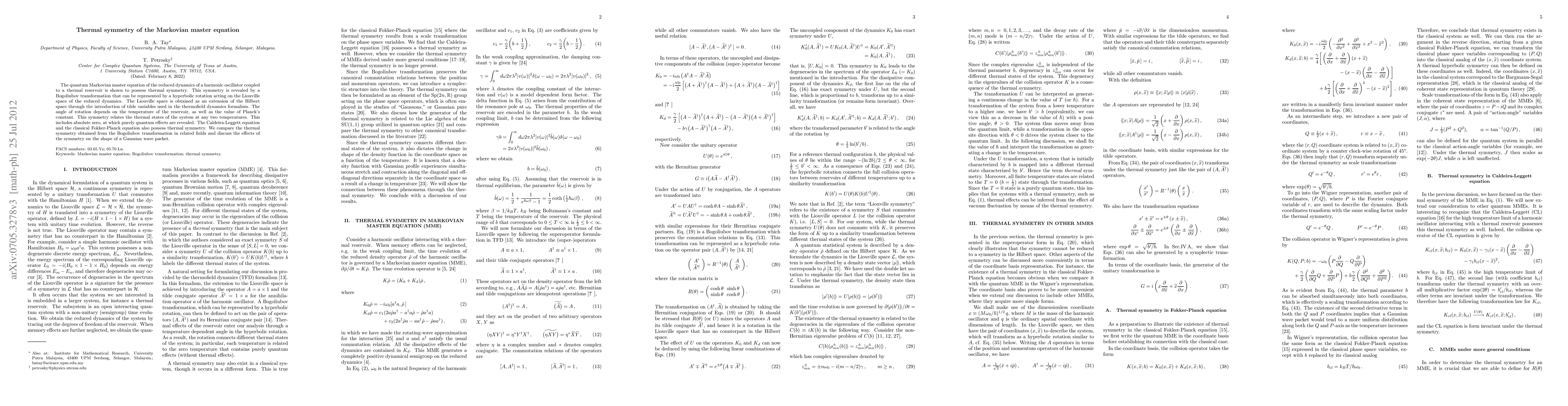 The quantum Markovian master equation of the reduced dynamics of a harmonic oscillator coupled to a thermal reservoir is shown to possess thermal symmetry. This symmetry is revealed by a Bogoliubov transformation that can be represented by a hyperbolic rotation acting on the Liouville space of the reduced dynamics. The Liouville space is obtained as an extension of the Hilbert space through the introduction of tilde variables used in the thermofield dynamics formalism. The angle of rotation depends on the temperature of the reservoir, as well as the value of Planck's constant. This symmetry relates the thermal states of the system at any two temperatures. This includes absolute zero, at which purely quantum effects are revealed. The Caldeira-Leggett equation and the classical Fokker-Planck equation also possess thermal symmetry. We compare the thermal symmetry obtained from the Bogoliubov transformation in related fields and discuss the effects of the symmetry on the shape of a Gaussian wave packet.