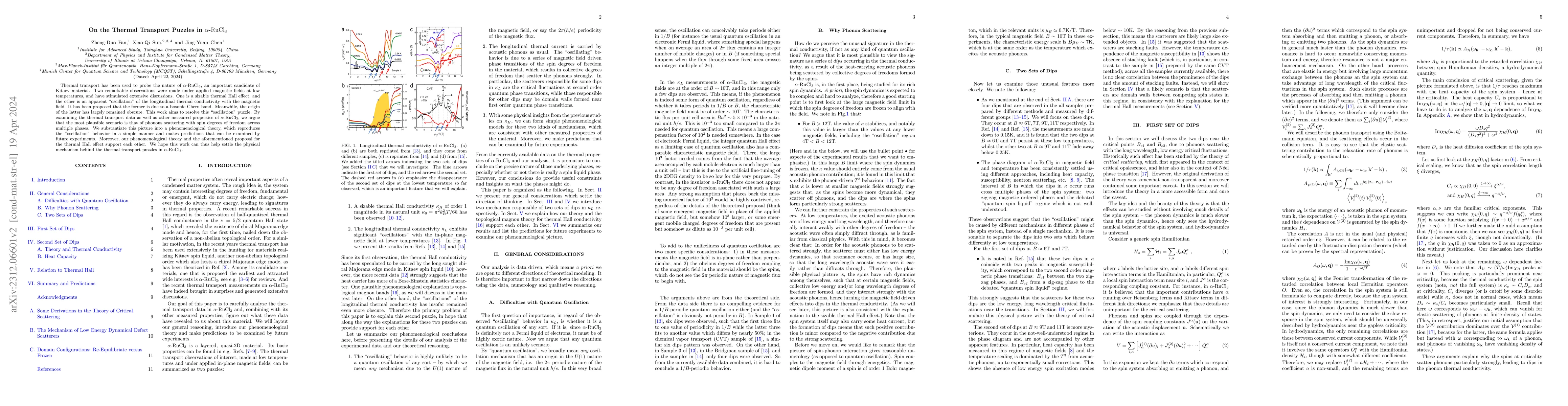 This paper investigates the thermal transport anomalies in $\alpha\mbox{-}\mathrm{RuCl}_3$ under magnetic fields, proposing that phonons scattering with spin degrees of freedom explains the "oscillation" in longitudinal thermal conductivity, and offering a phenomenological theory to support this. The theory also aligns with the proposed bosonic Chern band origin of the thermal Hall effect.