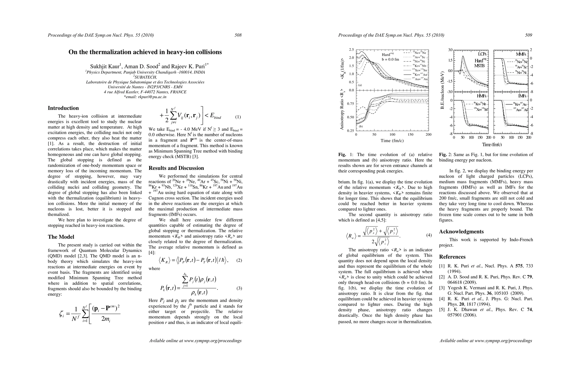 The paper simulates heavy-ion collisions using a hard Equation of State, Cugnon cross section, and MSTB method for clusterization. It finds that complete stopping of incoming nuclei requires very heavy systems, and uses fragment stability, relative momentum, anisotropy ratio, and rapidity distribution to study thermalization and stopping in these collisions.
