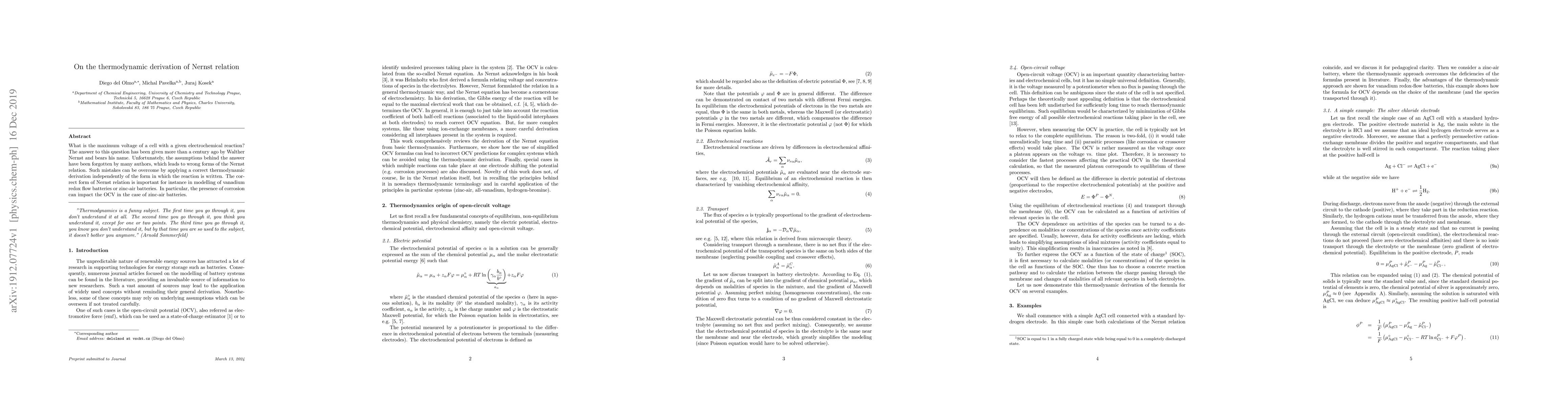 What is the maximum voltage of a cell with a given electrochemical reaction? The answer to this question has been given more than a century ago by Walther Nernst and bears his name. Unfortunately, the assumptions behind the answer have been forgotten by many authors, which leads to wrong forms of the Nernst relation. Such mistakes can be overcome by applying a correct thermodynamic derivation independently of the form in which the reaction is written. The correct form of Nernst relation is important for instance in modelling of vanadium redox flow batteries or zinc-air batteries. In particular, the presence of corrosion can impact the OCV in the case of zinc-air batteries.